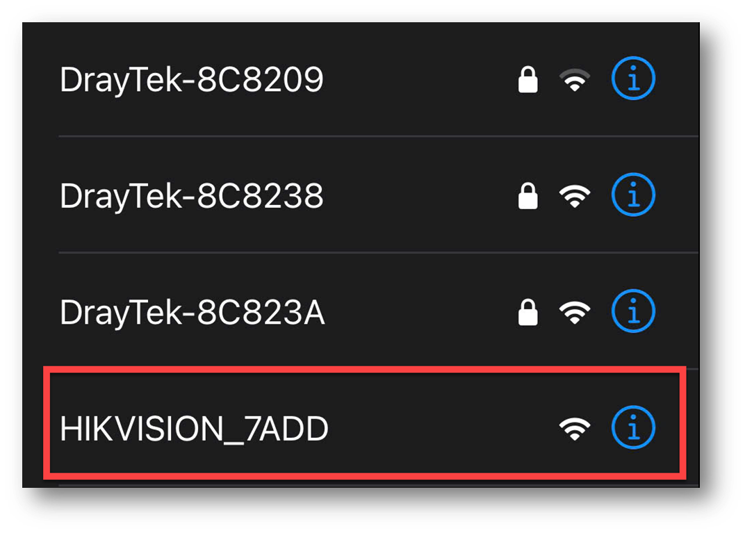 - iPhone → Cài đặt → Wi-Fi → Tìm & chọn HIKVISION_xxxx (tên ghi trên tem phía dưới thiết bị)