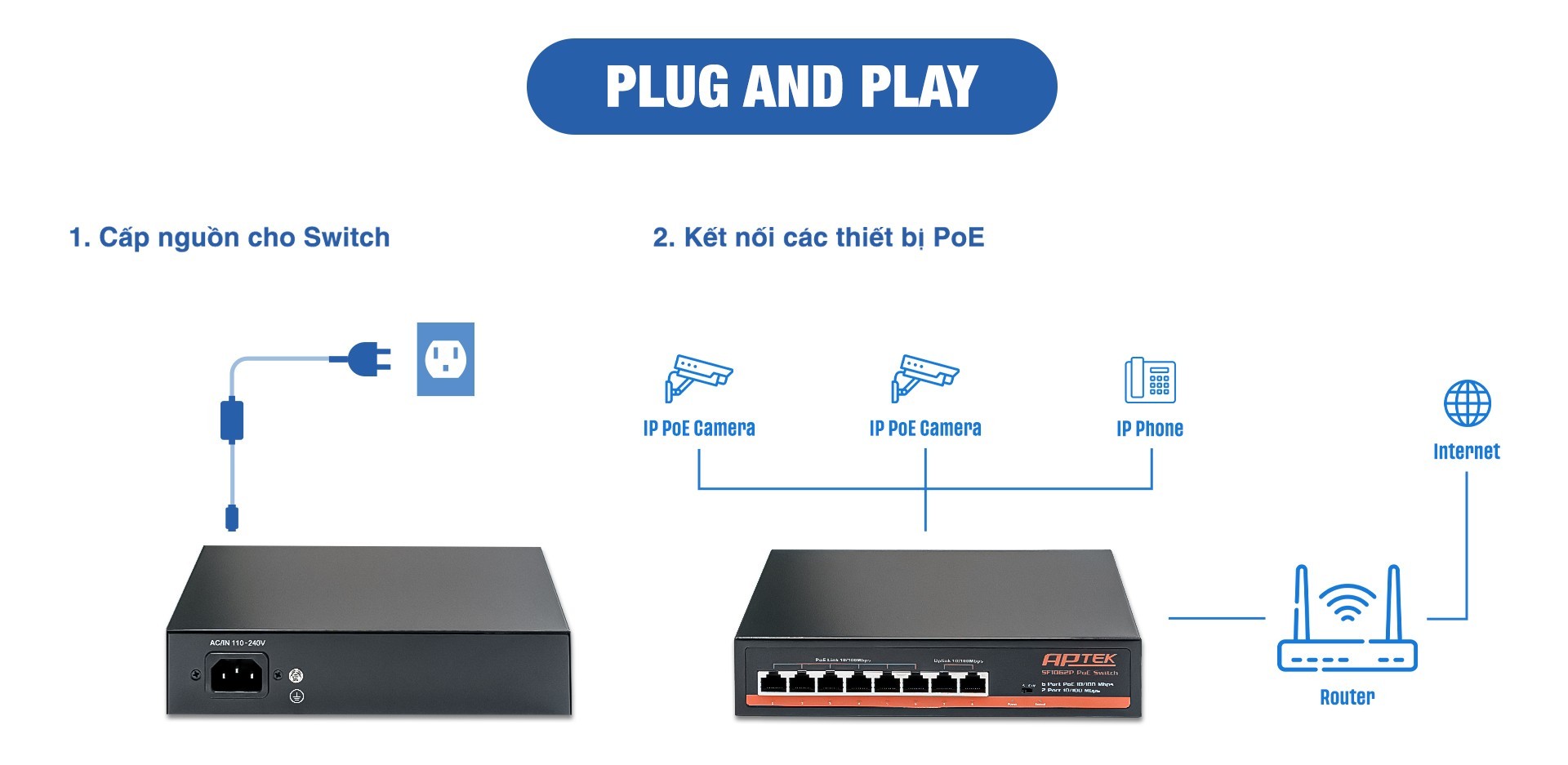 APTEK SF1062P mang lại trải nghiệm sử dụng cực kỳ đơn giản, chỉ cần cấp nguồn và kết nối các thiết bị là hệ thống đã sẵn sàng hoạt động ngay, hoàn toàn không phải cấu hình gì thêm. Việc bật/tắt tính năng VLAN cũng có thể thực hiện bằng nút gạt vật lý đơn giản.