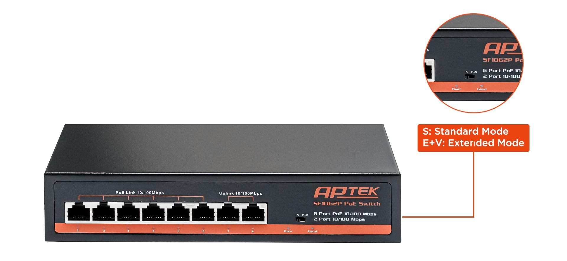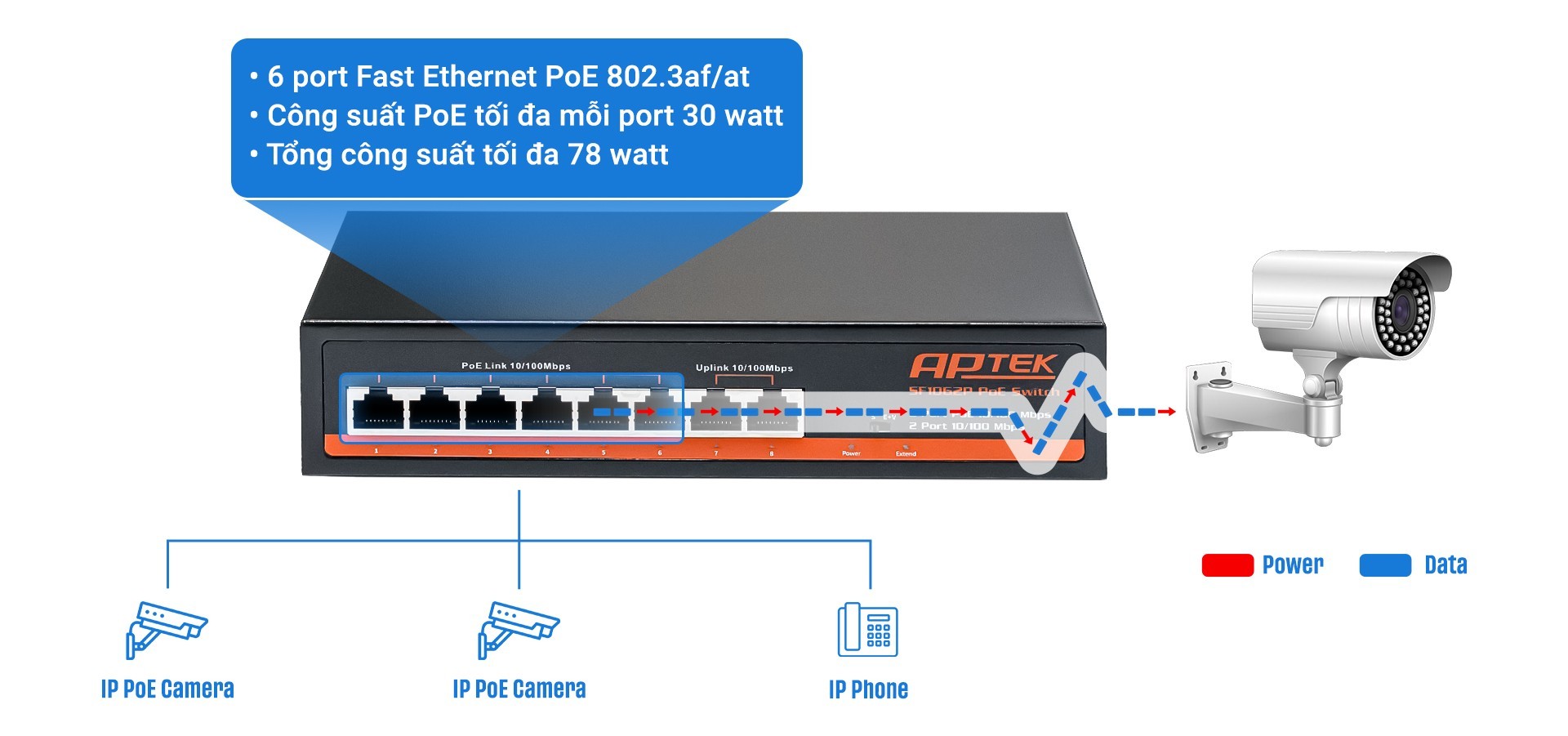 APTEK SF1062P trang bị 6 port PoE RJ45 10/100Mbps, hỗ trợ cấp nguồn tối đa 30W mỗi port theo chuẩn PoE 802.3af/at, tổng công suất 78W. Nhờ đó, switch APTEK dễ dàng đáp ứng yêu cầu của thiết bị tiêu thụ điện cao như camera PTZ, camera hồng ngoại. SF1062P mang lại giải pháp kết nối tiện lợi hơn nhờ khả năng cấp nguồn trực tiếp qua cáp mạng, giúp tối ưu chi phí triển khai đồng thời rút ngắn thời gian thi công do không phải kéo thêm cáp cấp nguồn riêng cho từng thiết bị.