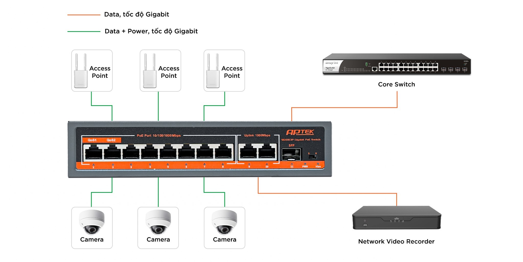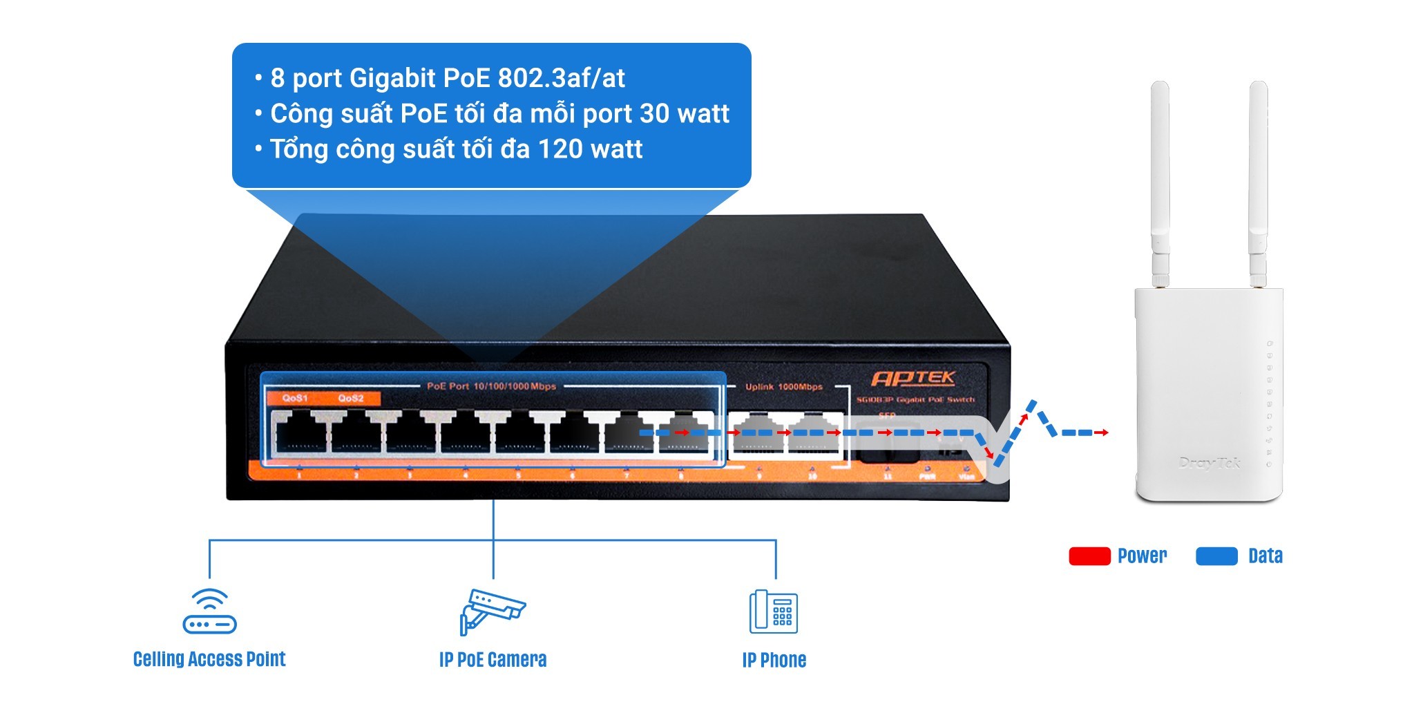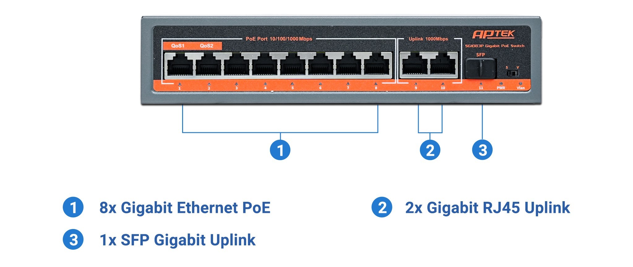 APTEK SG1083P là switch PoE không quản lý 8 port Gigabit, được thiết kế chuyên cho hệ thống Wi-Fi tốc độ cao và camera PTZ. Sản phẩm nổi bật với khả năng cấp nguồn PoE 802.3af/at, tổng công suất 120W, đáp ứng yêu cầu cấp nguồn cho nhiều thiết bị cùng lúc. SG1083P còn được trang bị port Uplink riêng để kết nối trực tiếp với router, switch trung tâm hoặc đầu ghi NVR, tối ưu hiệu quả sử dụng và đảm bảo toàn bộ port PoE sẵn sàng cho các thiết bị cần nguồn PoE.