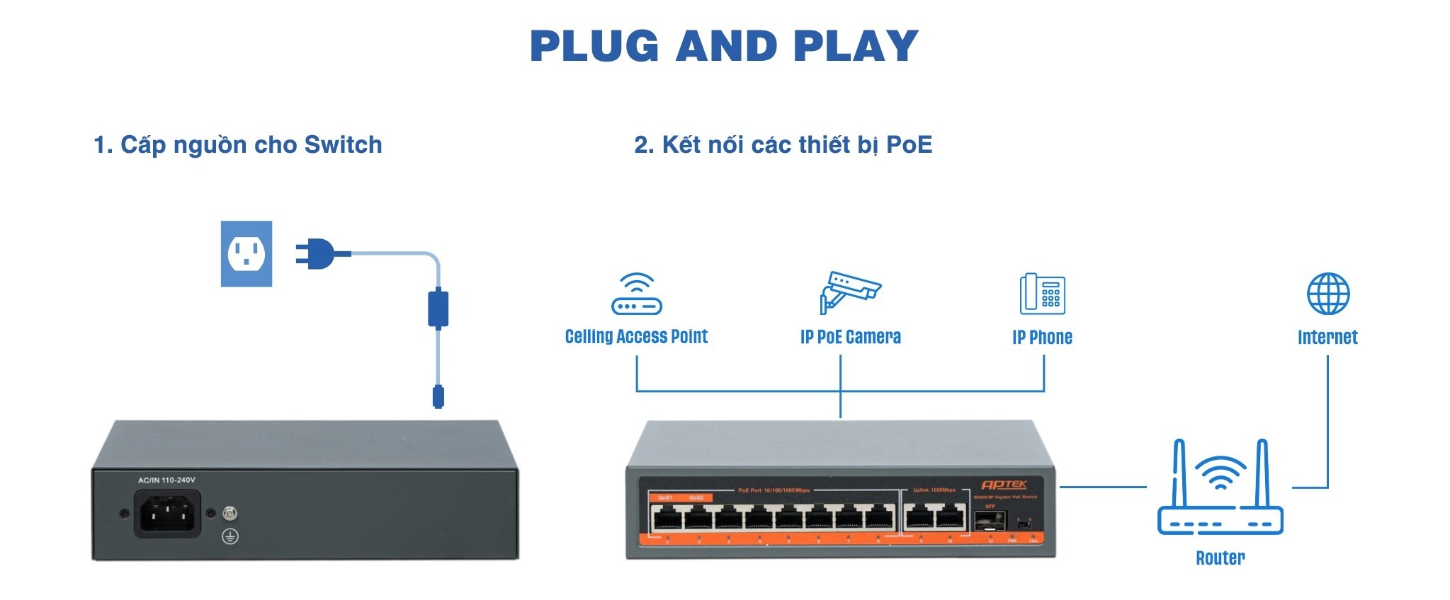 APTEK SG1083 mang lại trải nghiệm sử dụng cực kỳ đơn giản, chỉ cần cấp nguồn và kết nối các thiết bị là hệ thống đã sẵn sàng hoạt động ngay, hoàn toàn không phải cấu hình gì thêm. Việc bật/tắt tính năng VLAN cũng có thể thực hiện bằng nút gạt vật lý đơn giản.