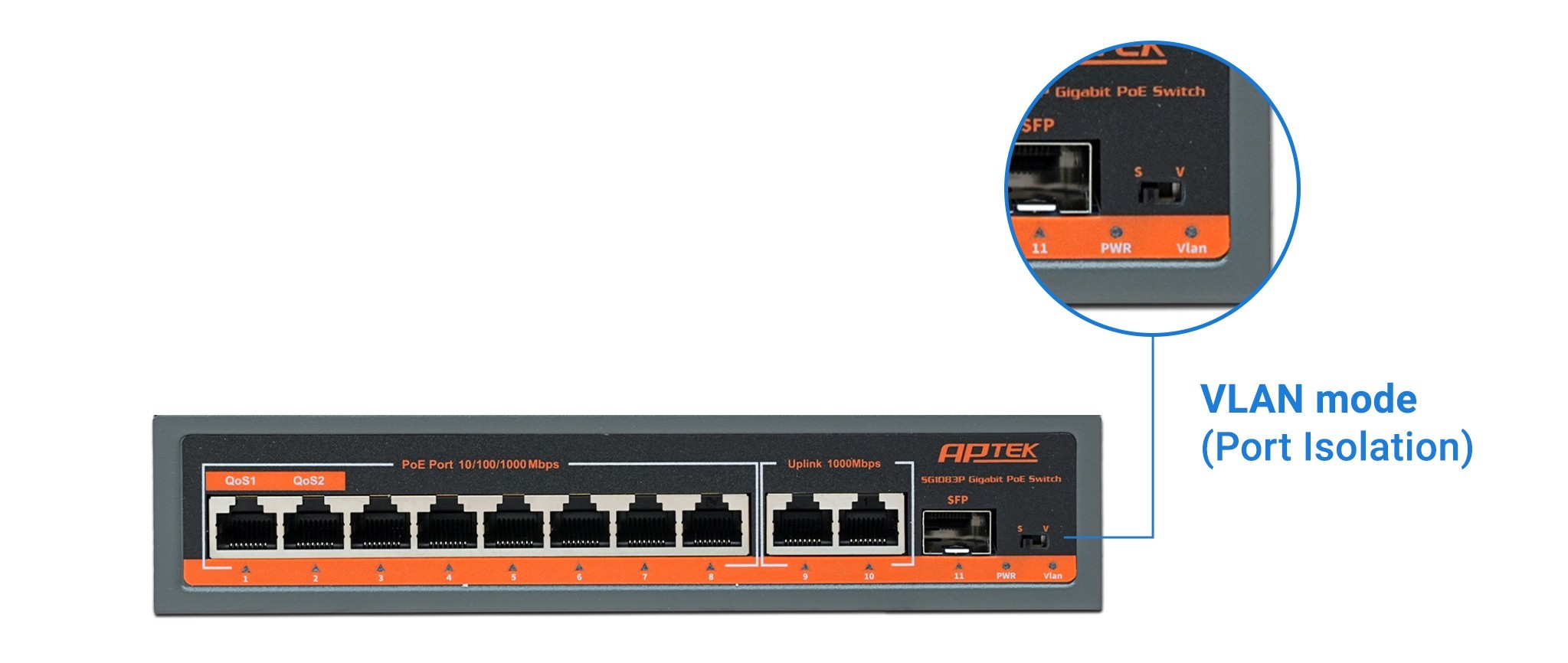 - Tích hợp VLAN mode (Port Isolation). Khi kích hoạt, các port PoE hoạt động tách biệt, chỉ kết nối trực tiếp đến port Uplink.