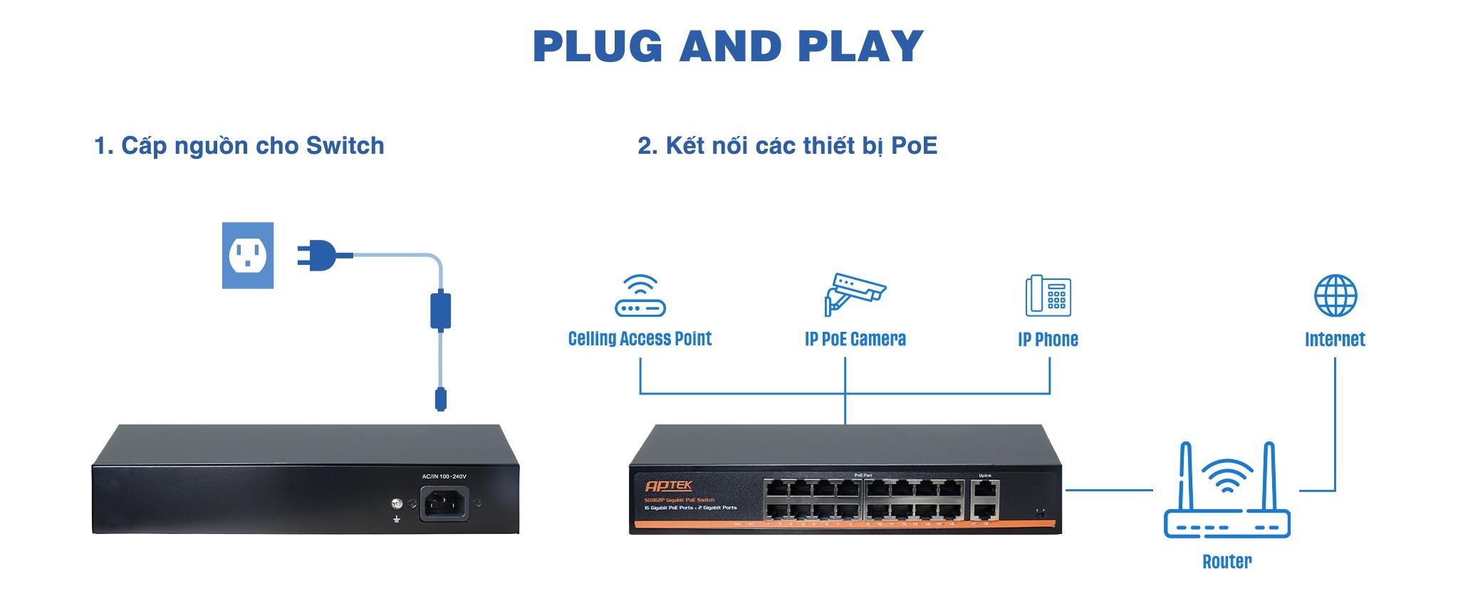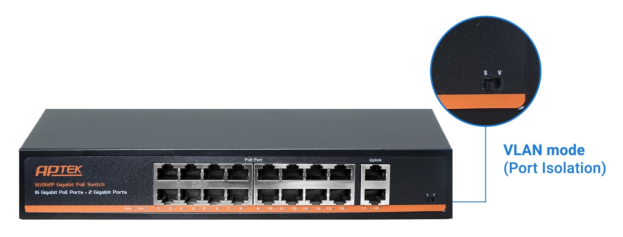 APTEK SG1162P mang lại trải nghiệm sử dụng cực kỳ đơn giản, chỉ cần cấp nguồn và kết nối các thiết bị là hệ thống đã sẵn sàng hoạt động ngay, hoàn toàn không phải cấu hình gì thêm. Việc bật/tắt tính năng VLAN cũng có thể thực hiện bằng nút gạt vật lý đơn giản.