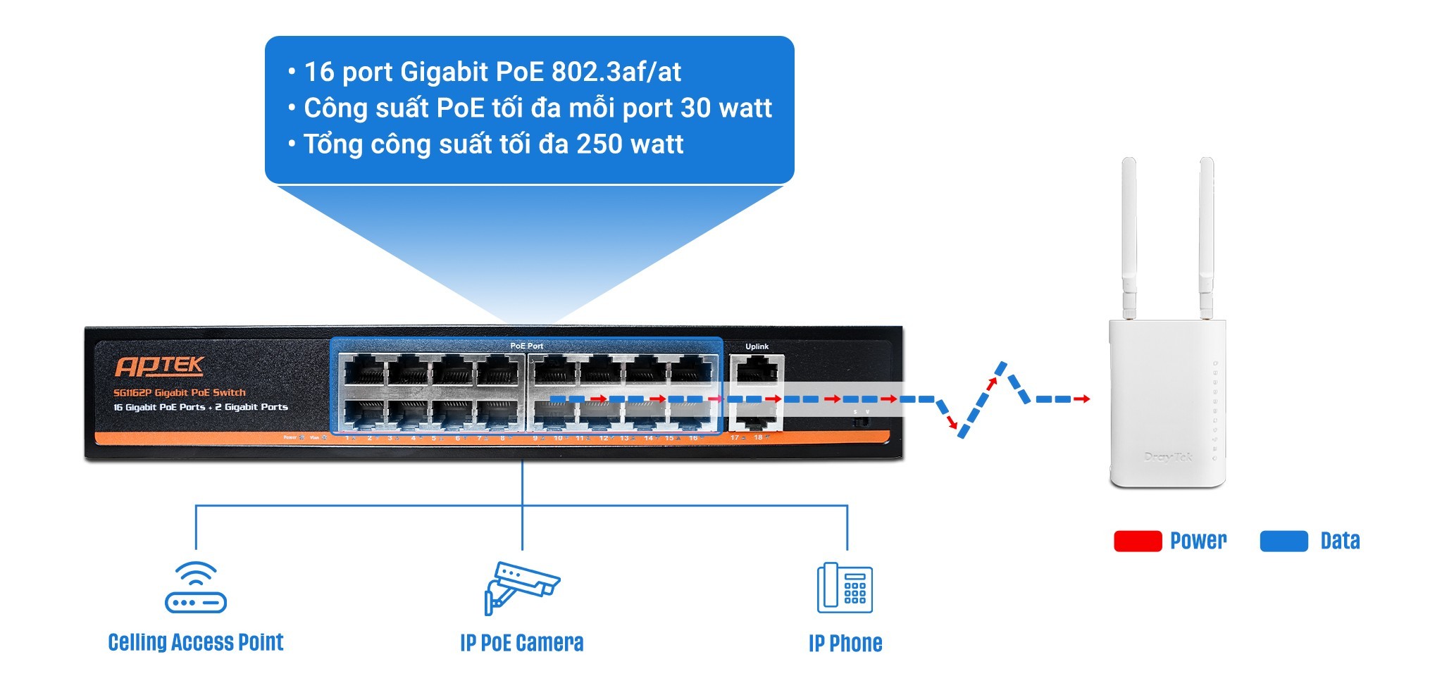 Tính năng PoE (cấp nguồn qua cáp mạng) giúp việc thi công trở nên đơn giản do không phải kéo thêm đường điện riêng cho từng thiết bị. Cụ thể SG1162P trang bị 16 port Gigabit hỗ trợ cấp nguồn theo chuẩn PoE/PoE+ lên đến 30W cho mỗi port 802.3af/at và tổng công suất 250W, đáp ứng hữu hiệu các thiết bị có mức tiêu thụ điện lớn như Access Point, camera PTZ.