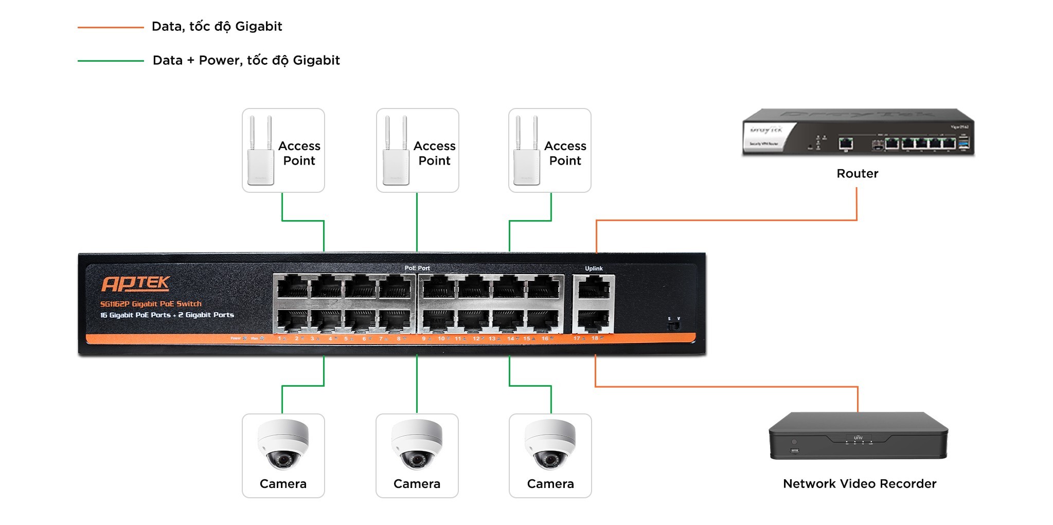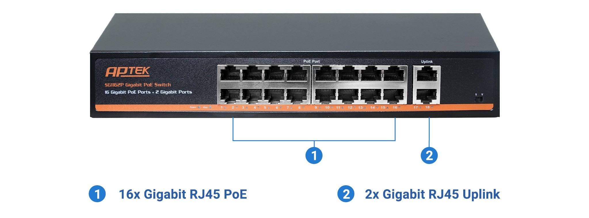 APTEK SG1162P là switch PoE không quản lý 16 port Gigabit, được thiết kế chuyên cho hệ thống Wi-Fi tốc độ cao và camera PTZ. Sản phẩm nổi bật với khả năng cấp nguồn PoE 802.3af/at, tổng công suất 250W, đáp ứng yêu cầu cấp nguồn cho nhiều thiết bị cùng lúc. SG1162P còn được trang bị port Uplink riêng để kết nối trực tiếp với router, switch trung tâm hoặc đầu ghi NVR, tối ưu hiệu quả sử dụng và đảm bảo toàn bộ port PoE sẵn sàng cho các thiết bị cần nguồn PoE.