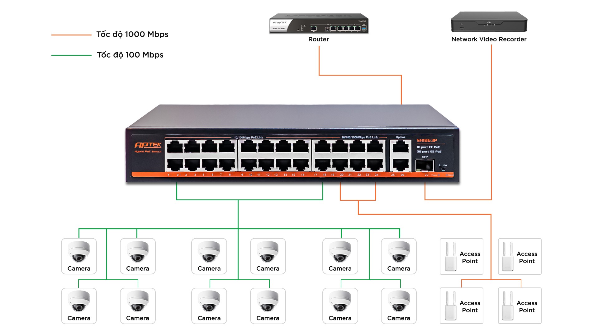 Điểm nổi bật của SH1863P là sự kết hợp giữa 18 cổng Fast Ethernet PoE và 6 cổng Gigabit PoE với tổng công suất PoE đến 400W. Với thiết kế "2-trong-1", SH1863P đáp ứng đúng nhu cầu thực tế của các hệ thống mạng phức hợp, dễ dàng đáp ứng nhiều loại thiết bị khác nhau với yêu cầu băng thông đa dạng. Cụ thể 18 cổng Fast Ethernet PoE dành cho các thiết bị băng thông thấp như IP camera cố định. Trong khi 6 cổng Gigabit PoE dành riêng cho các thiết bị đòi hỏi băng thông cao hơn như camera PTZ và Access Point Wi-Fi.
