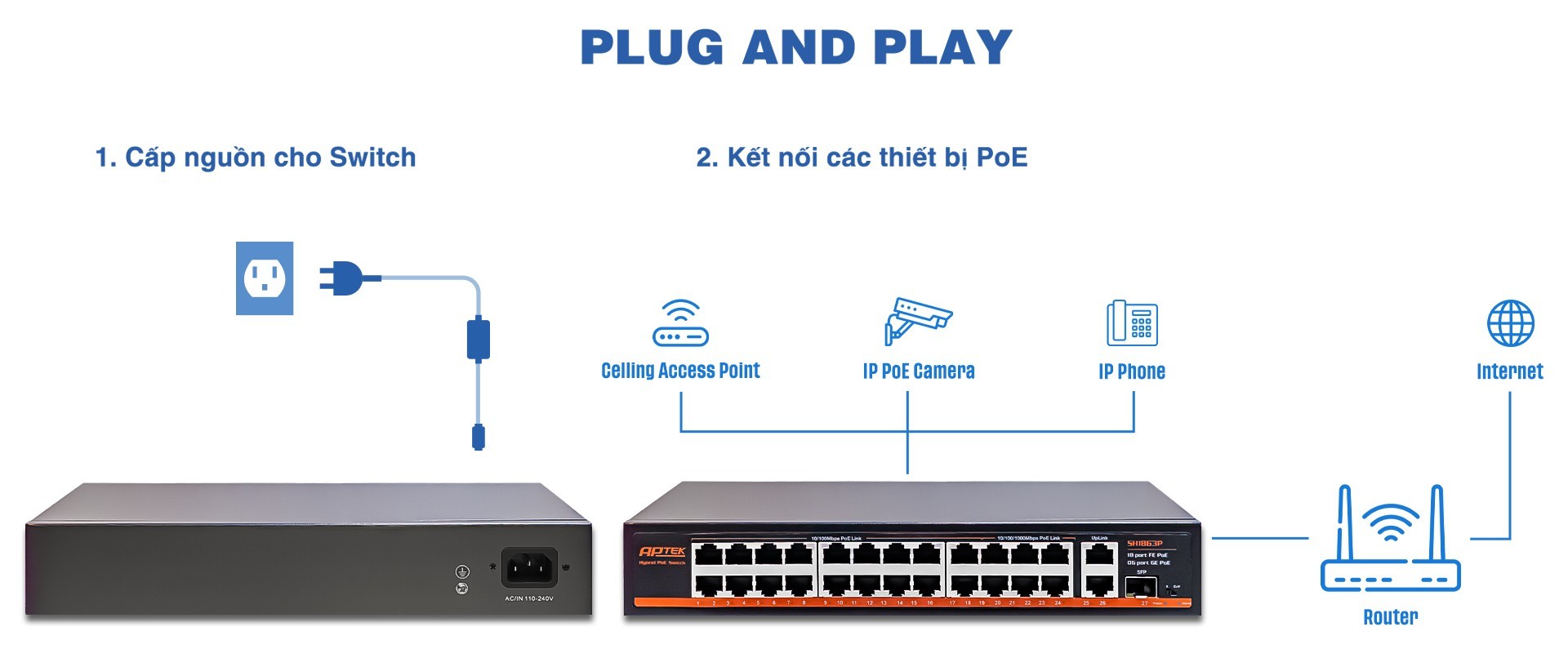 APTEK SH1863P thuộc dòng Switch không quản lý (Unmanaged Switch). Chỉ cần cấp nguồn, cắm cáp nối với camera là hệ thống có thể hoạt động lập tức. Các tính năng như Auto MDI/MDIX với khả năng tự động nhận biết và điều chỉnh lại cấu hình cổng mạng cho phù hợp với loại cáp (cáp thẳng hoặc cáp chéo) đang sử dụng. Người dùng không phải cân nhắc lựa chọn giữa cáp thẳng hoặc cáp chéo để kết nối thiết bị, điều này giúp đơn giản hóa việc thi công lắp đặt cũng như hạn chế lỗi tương thích từ thiết bị.