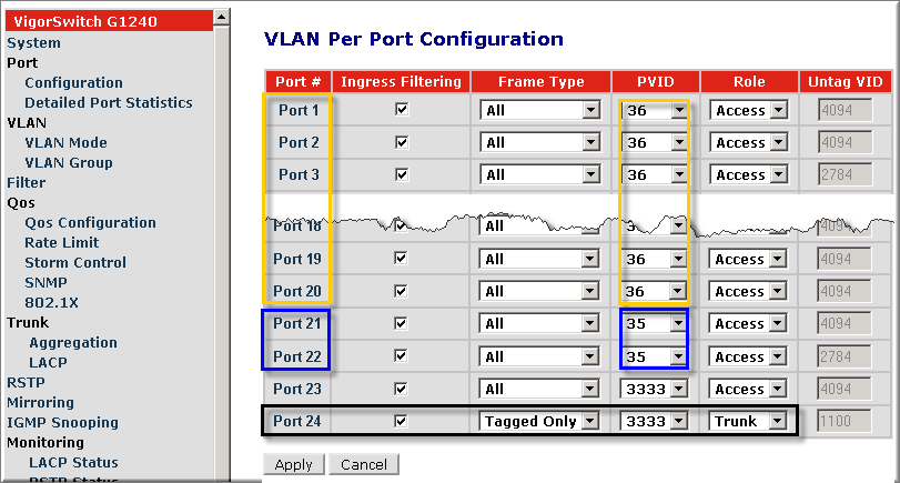 Vlan 35 (Vlan Internet): Port 21, 22, 24 (port trunk)