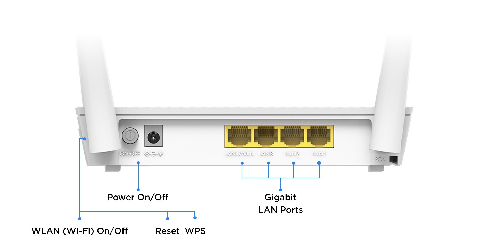 | LED Indicators | Power, PON, LOS, Internet, LAN 1~4, Wi-Fi (2.4 GHz, 5 GHz), WPS |