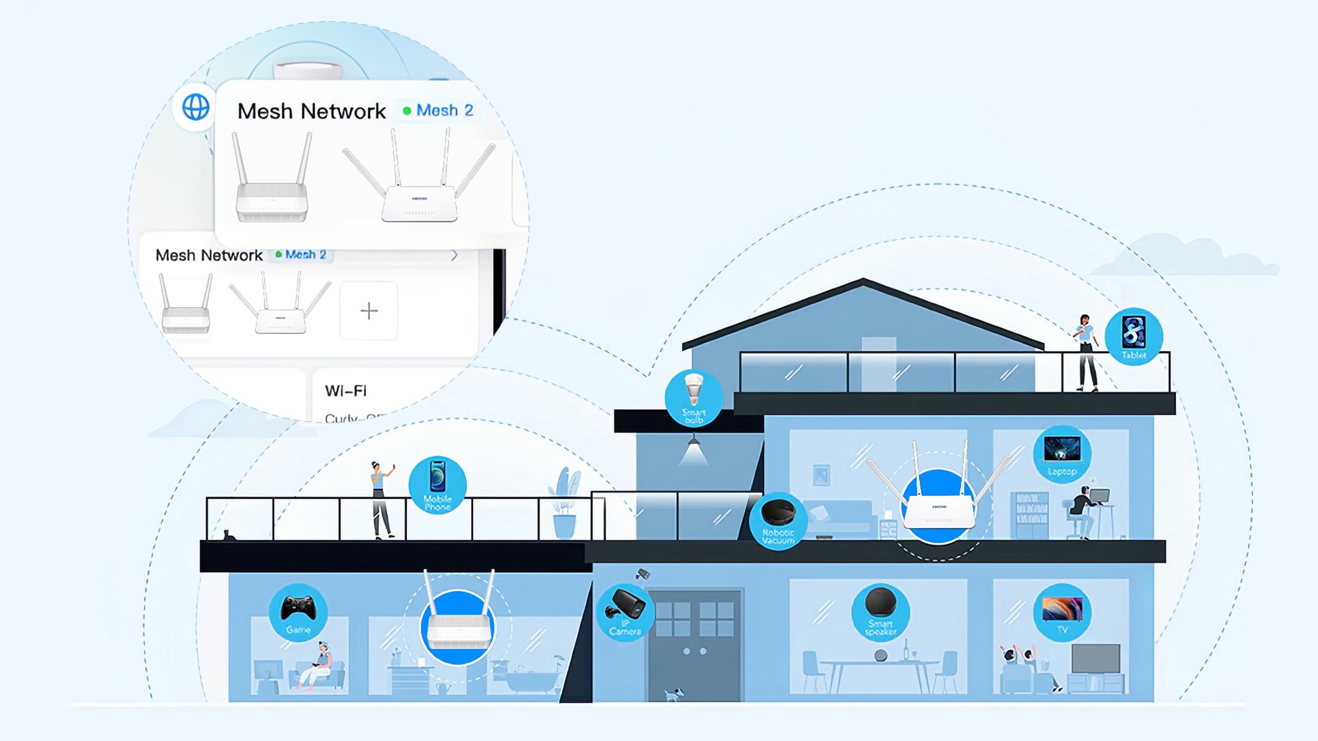 Dễ dàng tạo một mạng lưới Wi-Fi phủ sóng toàn bộ ngôi nhà bằng cách kết hợp GP1200 với các thiết bị Mesh tương thích khác như APTEK AR1200 để tạo thành mạng lưới đồng nhất, giúp phủ sóng Wi-Fi khắp không gian rộng lớn mà không có điểm chết.