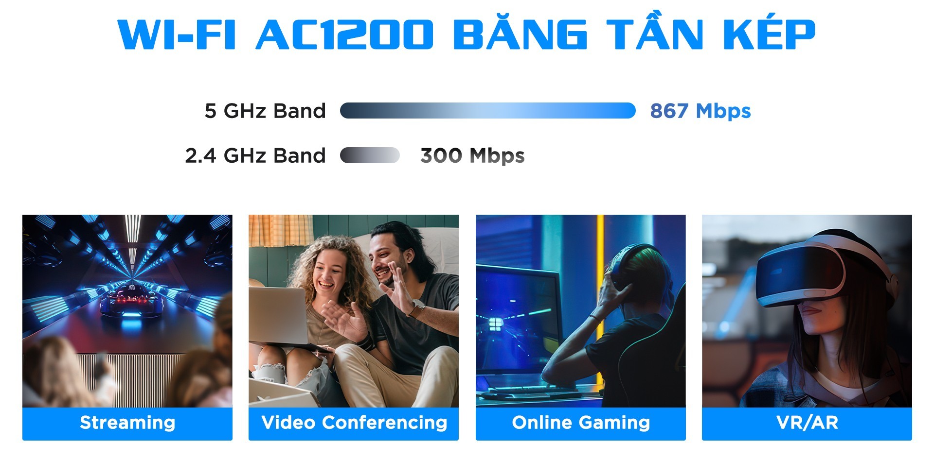 Tốc độ Wi-Fi lên đến 1.2 Gbps, gồm 300 Mbps trên băng tần 2.4 GHz cho nhu cầu đơn giản lướt web, email và 867 Mbps trên băng tần 5 GHz cho việc streaming video 4K, chơi game online.