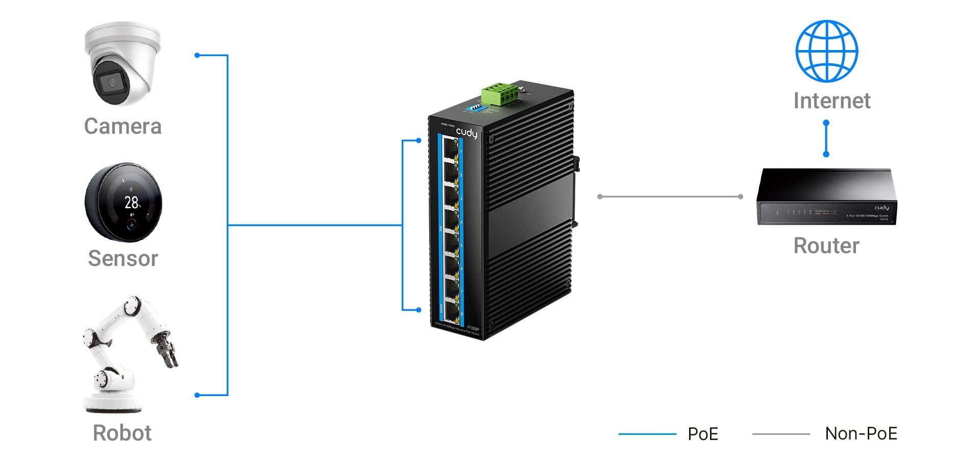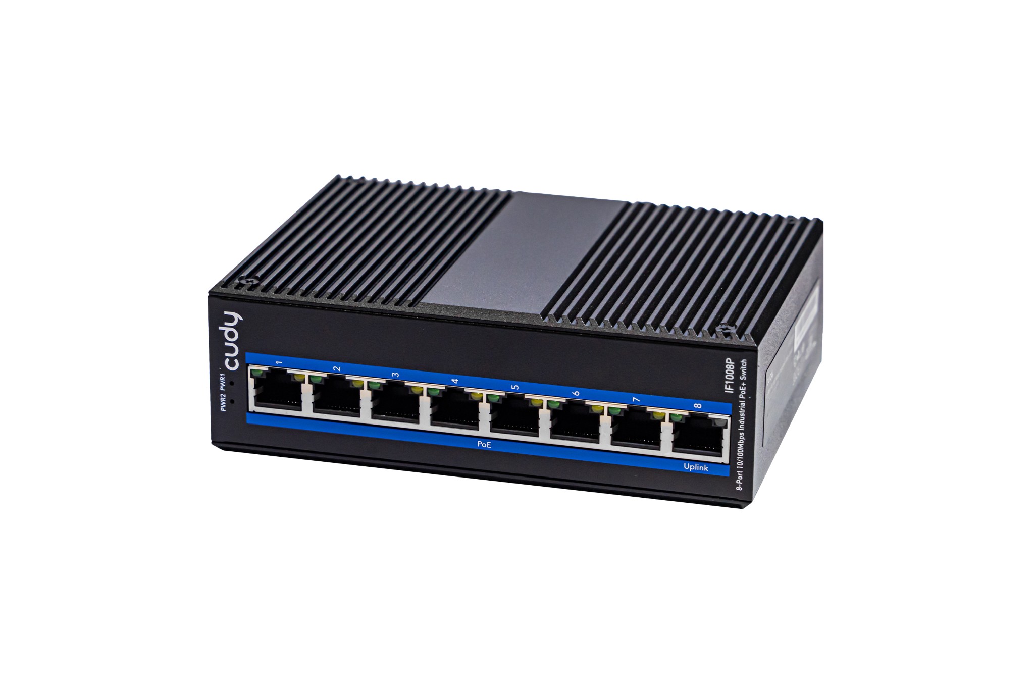 Cudy IF1008P trang bị 8 cổng LAN hỗ trợ PoE+ với công suất tối đa 30W mỗi cổng và tổng công suất 240W. Switch có thể đáp ứng linh hoạt nhu cầu kết nối cũng như cấp nguồn ổn định cho nhiều loại thiết bị; từ các thiết bị công suất cao như camera PTZ, cho tới cảm biến IoT và bộ điều khiển trong dây chuyền sản xuất.