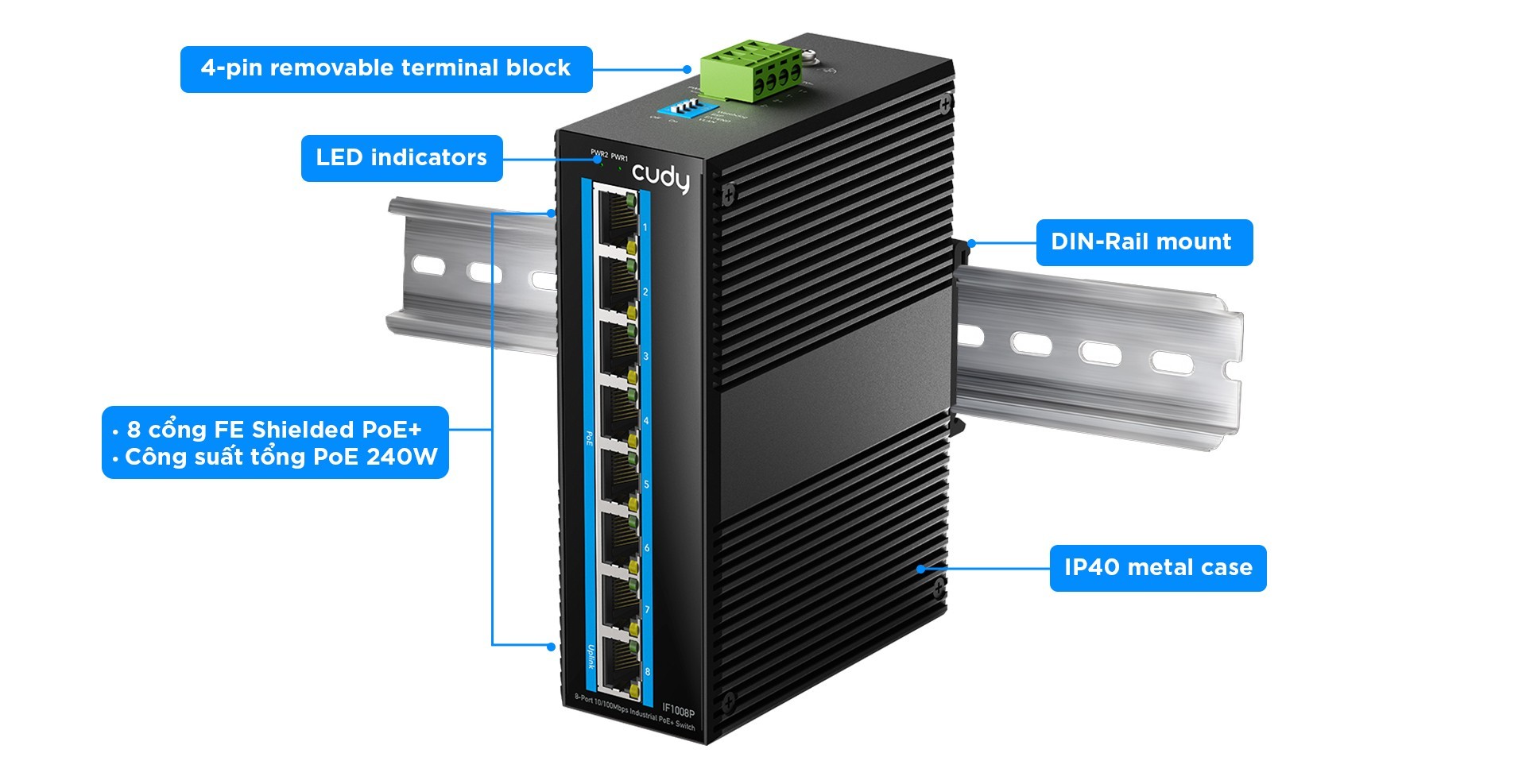 Switch PoE công nghiệp chuyên cho camera PTZ, 8 cổng PoE công suất tổng 240W, vỏ nhôm chuẩn IP40, nguồn dự phòng kép.