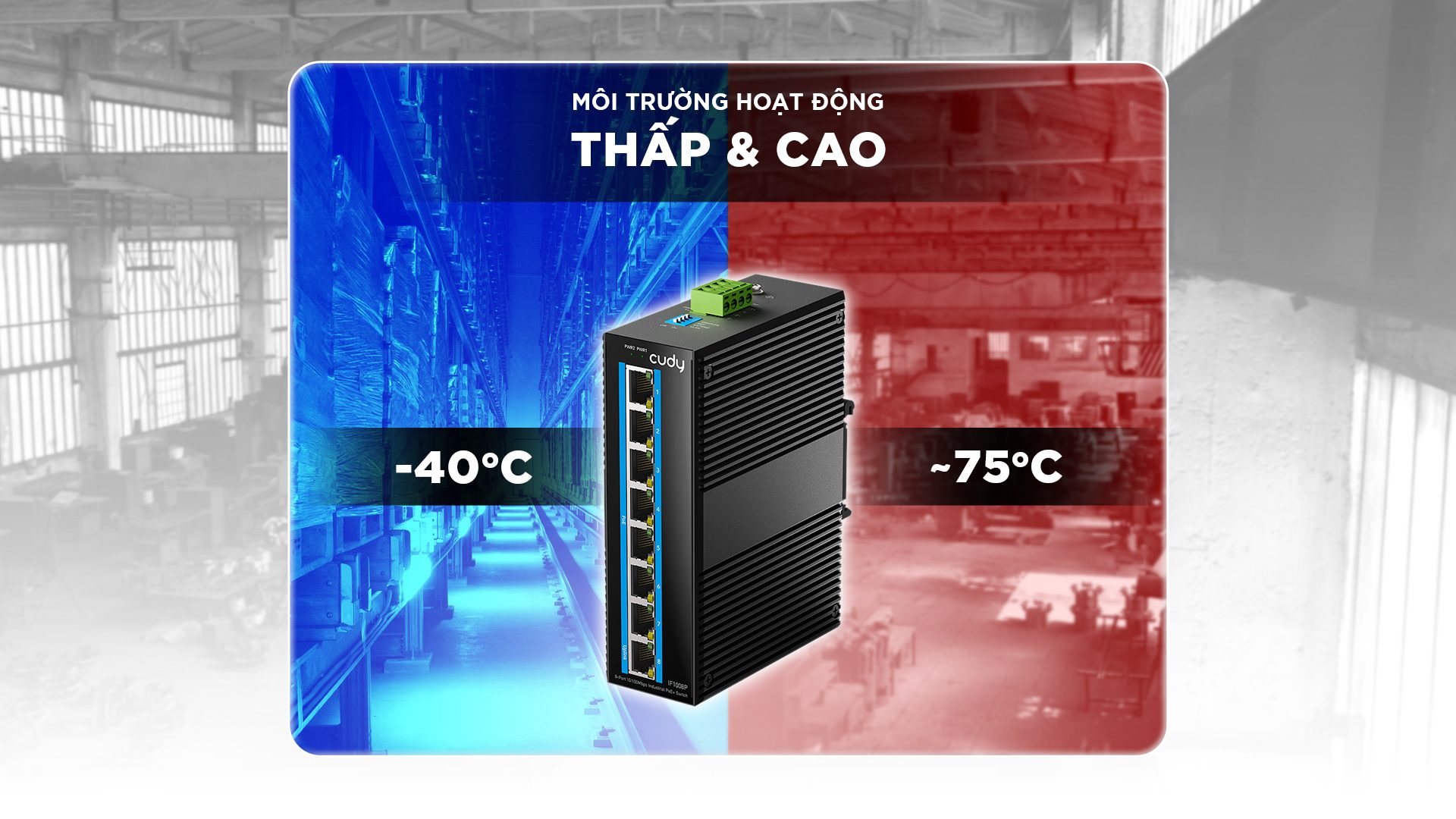 Cudy IF1008P thuộc dòng switch công nghiệp được thiết kế chuyên biệt, đáp ứng các yêu cầu khắt khe trong môi trường sản xuất, năng lượng, giao thông hay hàng hải. Với lớp vỏ nhôm chuẩn IP40, khả năng chịu nhiệt độ từ -40°C đến 75°C và nguồn DC kép dự phòng, IF1008P đảm bảo hoạt động ổn định, liên tục trong mọi điều kiện khắc nghiệt.
