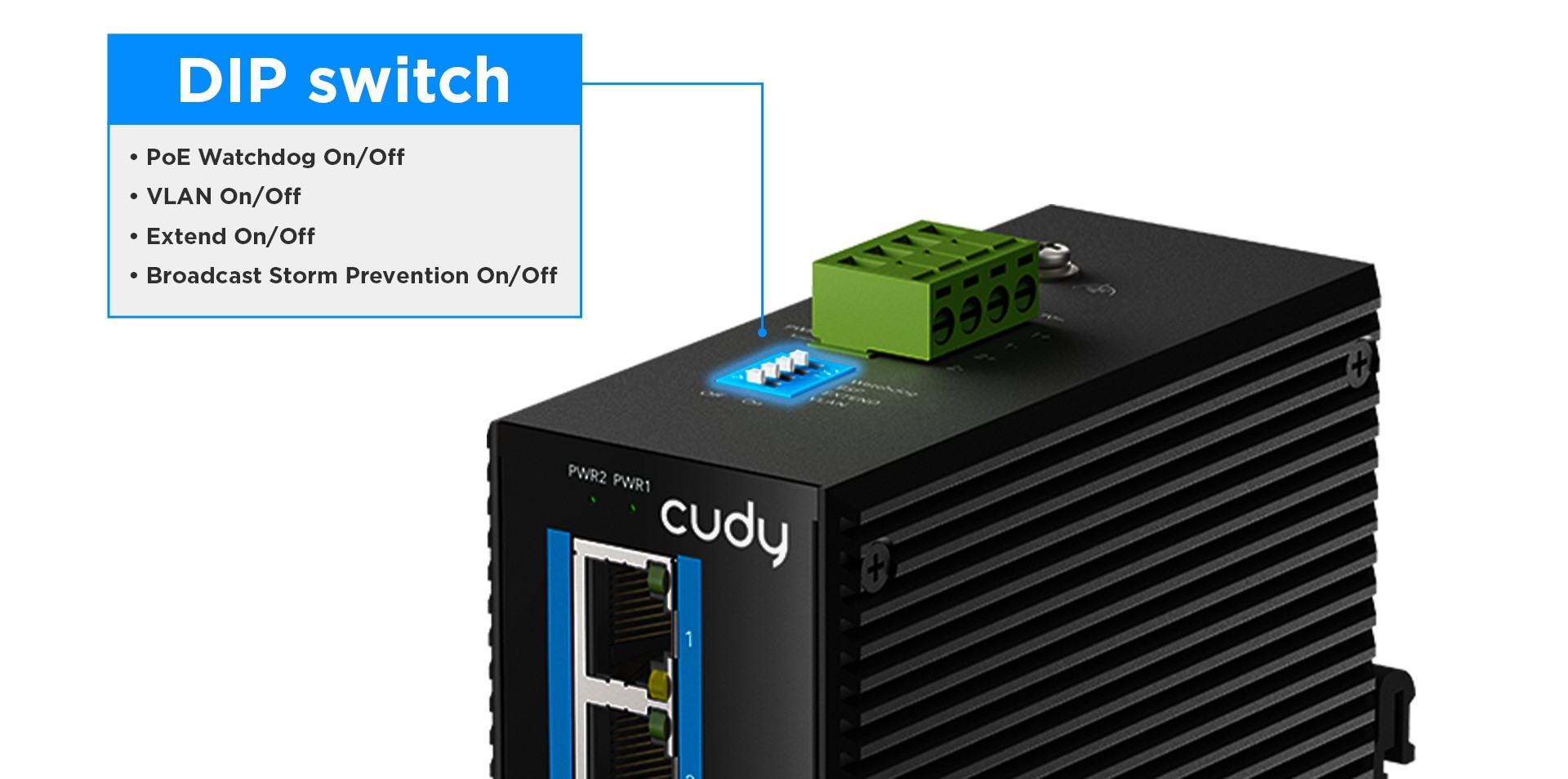 Cudy IF1008P không chỉ ấn tượng với thiết kế bền bỉ theo chuẩn công nghiệp mà còn được trang bị hai tính năng thông minh gồm PoE Watchdog và Storm Control. Các tính năng này được kích hoạt dễ dàng qua công tắc gạt trực tiếp, vừa đơn giản vừa hiệu quả, giúp nâng cao độ ổn định và tăng cường khả năng phục hồi nhanh cho hạ tầng mạng trong môi trường công nghiệp khắc nghiệt.