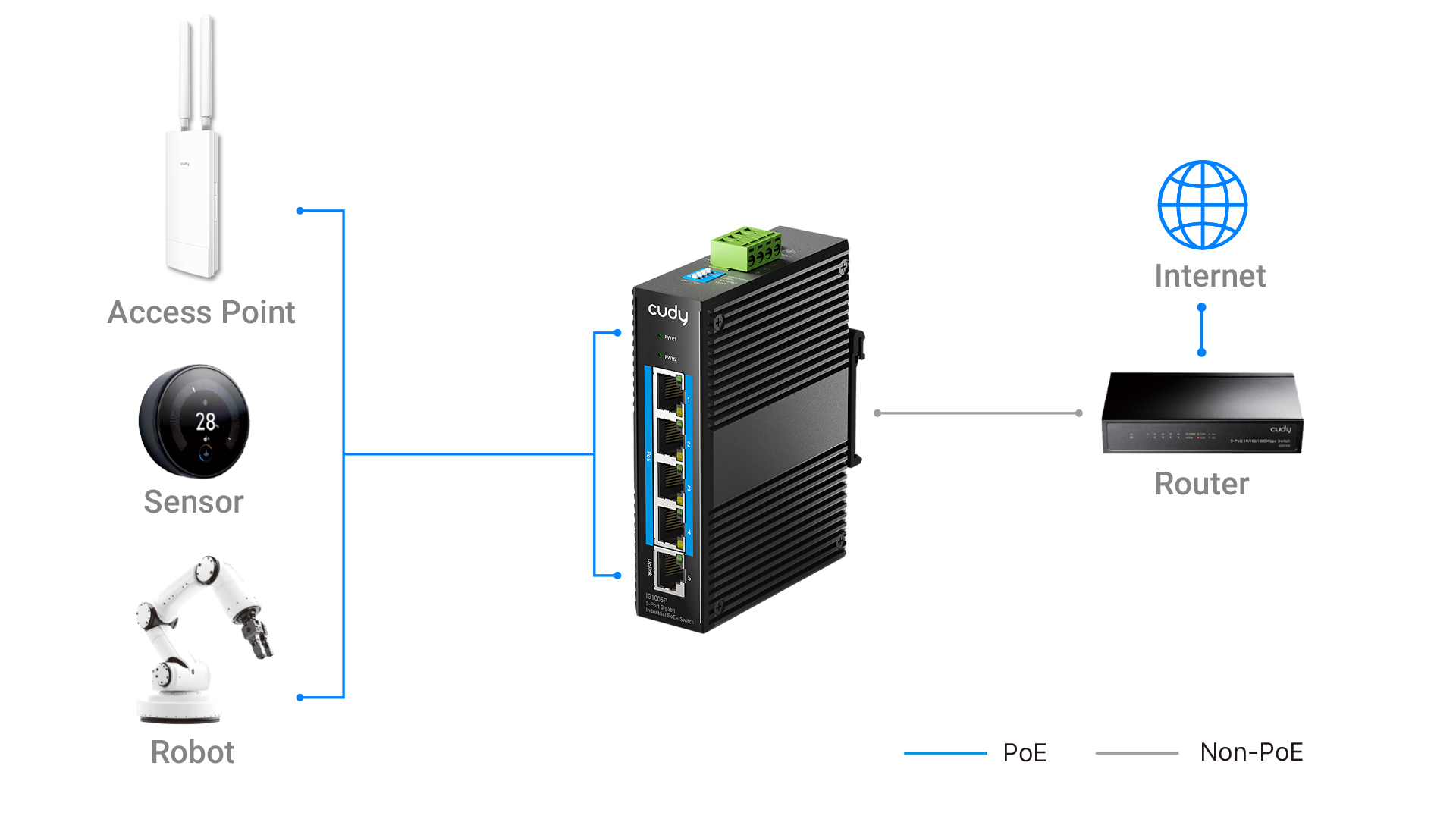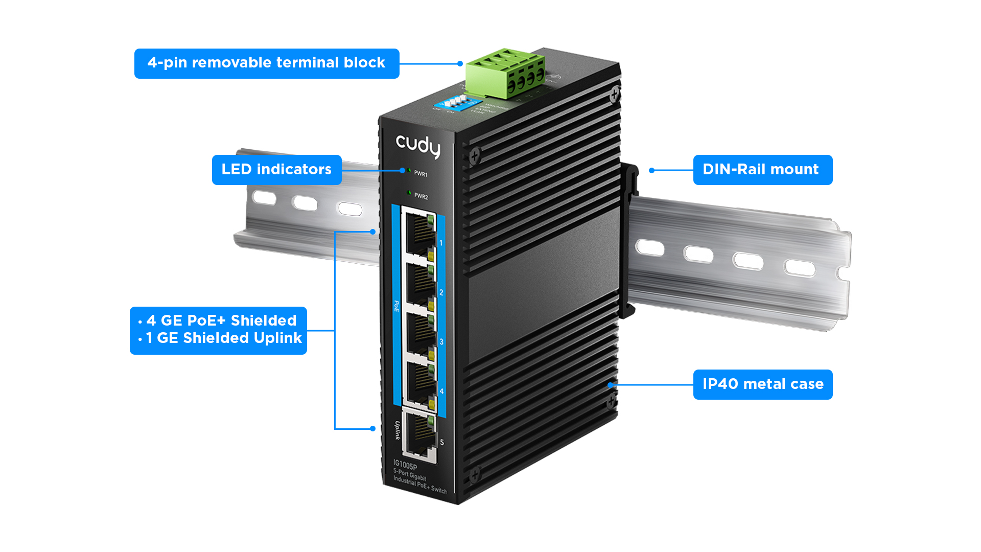 Cudy IG1005P phù hợp cho các ứng dụng camera PTZ, Access Point công nghiệp hay thiết bị công nghiệp thông minh cần kết nối mạng tốc độ cao, đáng tin cậy. Với lớp vỏ nhôm chuẩn IP40, chịu được nhiệt độ từ -40°C đến 75°C và nguồn DC kép dự phòng, IG1005P đảm bảo hoạt động ổn định, liên tục trong môi trường sản xuất, năng lượng, giao thông hay hàng hải.