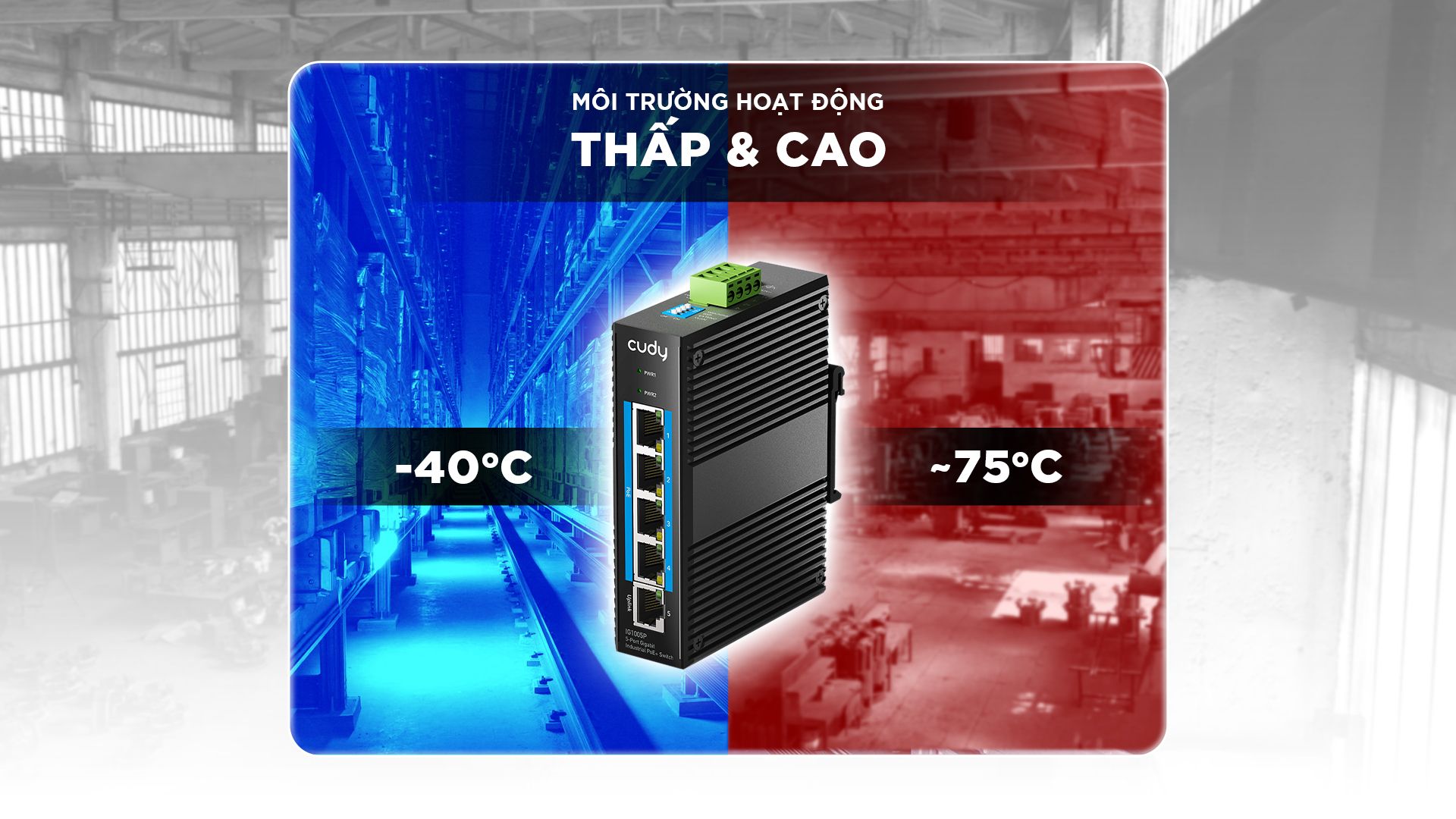 Lớp vỏ nhôm nguyên khối cứng cáp của Cudy IG1005P giúp chống chịu va đập, rung động và đồng thời hoạt động như một bộ tản nhiệt thụ động hiệu quả. Nhờ đó, thiết bị vận hành ổn định mà không cần quạt, loại bỏ nguy cơ hỏng hóc từ bộ phận cơ học và ngăn bụi bẩn xâm nhập với chuẩn bảo vệ IP40.