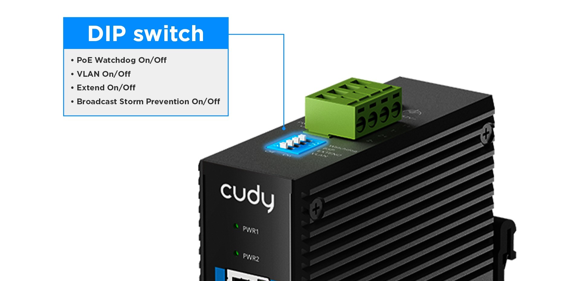 Cudy IG1005P không chỉ ấn tượng với thiết kế bền bỉ theo chuẩn công nghiệp mà còn được tích hợp loạt tính năng thông minh. Các tính năng này được kích hoạt dễ dàng qua công tắc gạt trực tiếp, vừa đơn giản vừa hiệu quả, giúp nâng cao độ ổn định và tăng cường khả năng phục hồi nhanh cho hạ tầng mạng trong môi trường công nghiệp khắc nghiệt.
