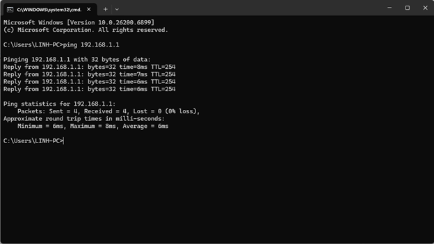 Máy tính kết nối LT300, thực hiện ping IP router đầu xa: