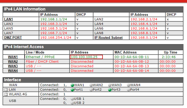 - Vào WAN>> Online status, xem IP WAN thiết bị