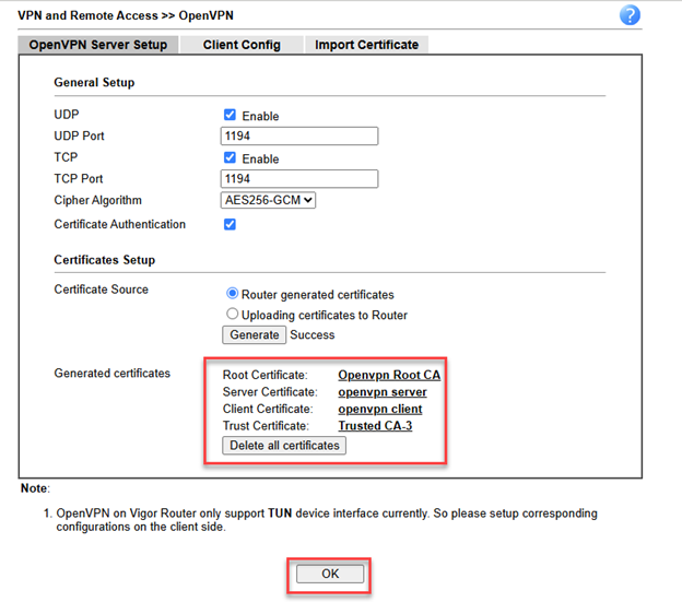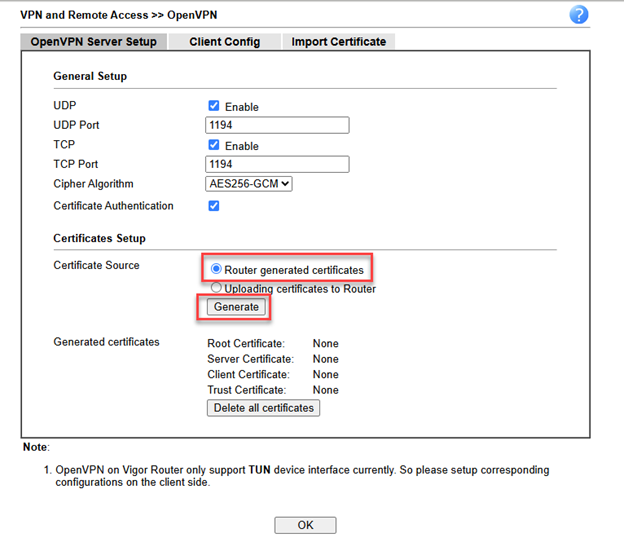 - Certificates Setup, Certificate Source chọn “Router generated certificates”>> nhấn “GENERATE” để Router tự động tạo Certificate