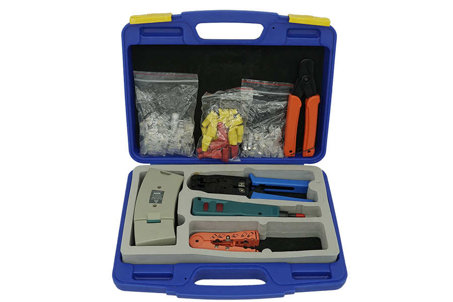 - Bộ dụng cụ bao gồm kềm, máy kiểm tra cáp, tool nhấn cáp mạng, đầu mạng và khóa đầu mạng…