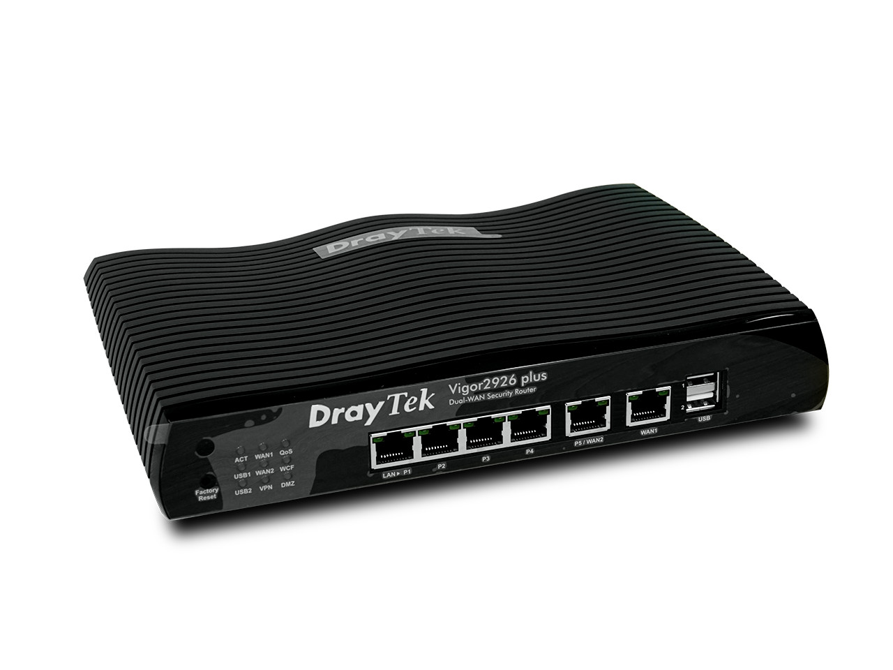 Vigor2926 Plus là bộ định tuyến Dual WAN tích hợp tường lửa bảo mật giúp đảm bảo kết nối Internet ổn định. Thiết bị có 2 cổng Gigabit Ethernet WAN và 2 cổng USB có thể kết nối Internet thông qua USB 3G/4G/LTE. Vigor2926 Plus cho phép kết nối đồng thời lên đến 4 đường Internet, cân bằng tải hoặc chuyển đổi dự phòng. Vigor2926 Plus không chỉ là thiết bị kết nối Internet đáng tin cậy, mà còn là cổng kết nối tường lửa linh hoạt và máy chủ VPN, thiết bị cũng bao gồm các tính năng quản lý mạng LAN toàn diện như VLAN, quản lí băng thông (Bandwidth Management), quản lý dịch vụ (Quality of service), kiểm soát DNS, giúp Vigor2926 Plus trở thành một giải pháp hoàn hảo cho doanh nghiệp.