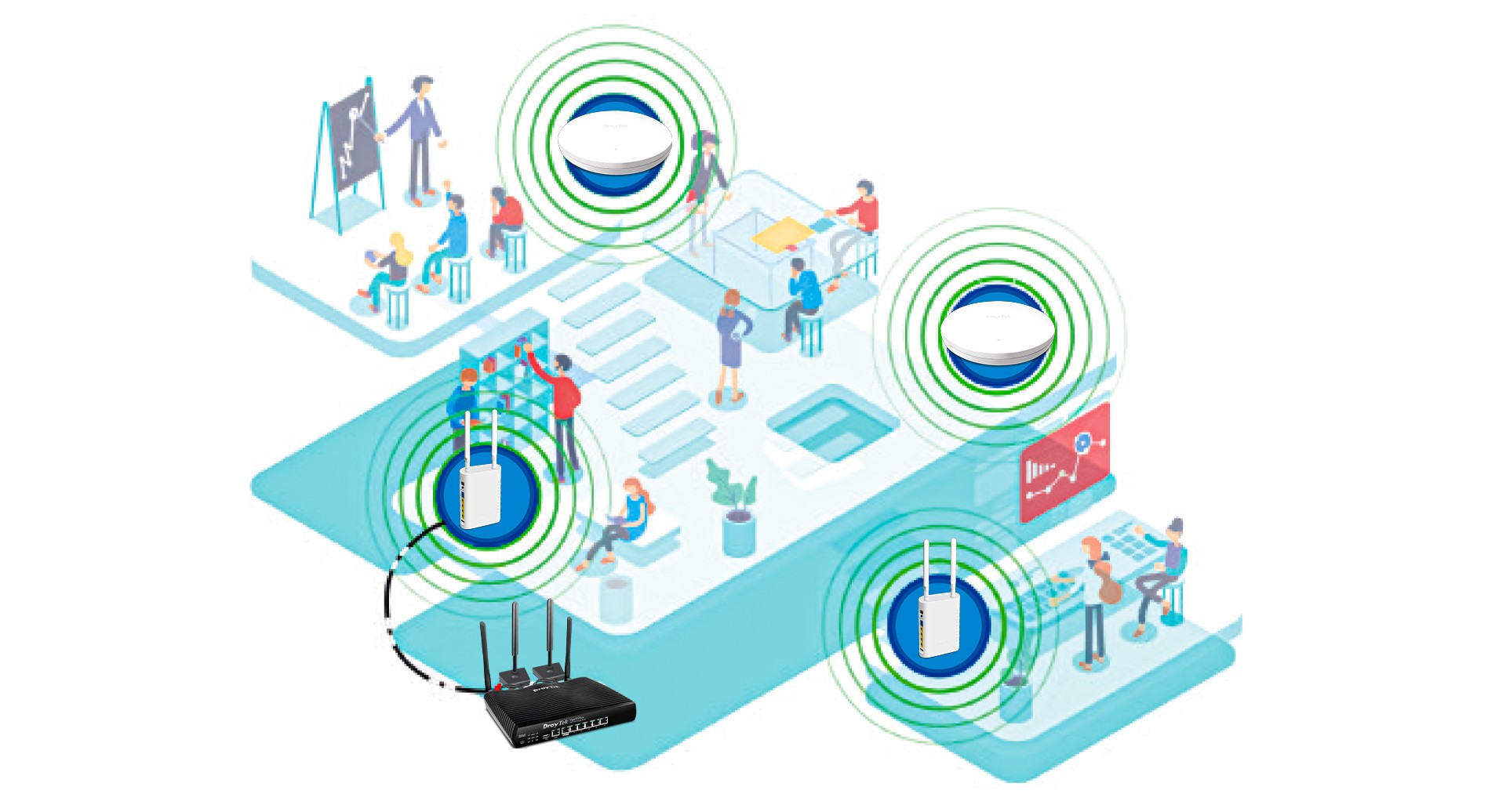 Vigor2927Lac còn đóng vai trò Mesh Root trong hệ thống DrayTek Mesh. Khi doanh nghiệp cần mở rộng mạng Wi-Fi đáp ứng nhu cầu phát triển, chỉ cần bổ sung các thiết bị VigorAP hỗ trợ Mesh, hệ thống sẽ tự động liên kết với Vigor2927Lac và thiết đặt cấu hình nhất quán để tạo thành mạng Wi-Fi liền mạch. Người dùng di chuyển trong văn phòng sẽ được chuyển tiếp kết nối (roaming) tự động đến điểm phát sóng có tín hiệu mạnh nhất, đảm bảo trải nghiệm Wi-Fi mượt mà và ổn định.
