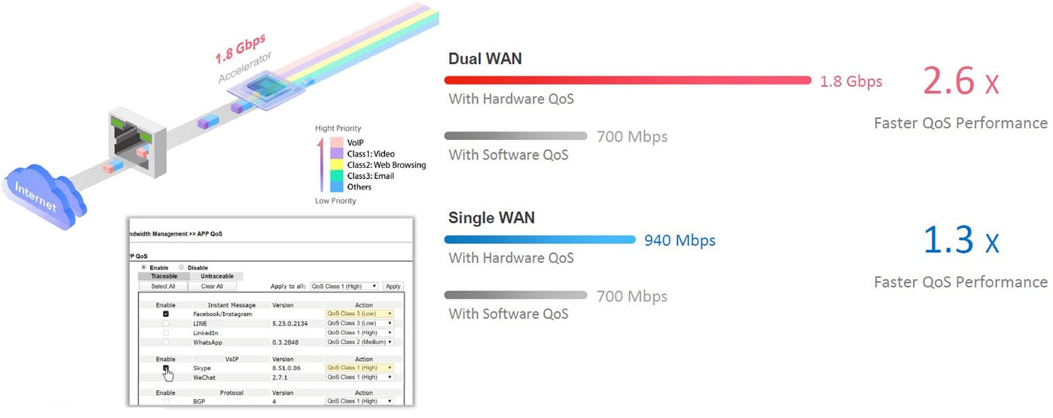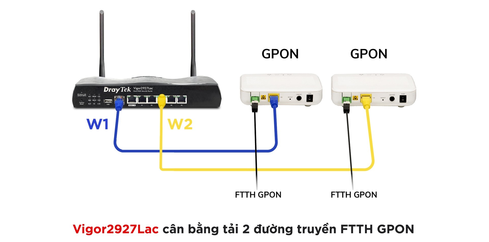 DrayTek Vigor2927Lac được trang bị hai cổng WAN Gigabit Ethernet, mang đến khả năng kết hợp băng thông và dự phòng thông minh (Load Balancing & Failover) cho các doanh nghiệp cần kết nối Internet ổn định và tốc độ cao. Việc hỗ trợ 2 WAN đồng thời giúp Vigor2927Lac có thể tự động phân phối luồng truy cập mạng trên cả hai đường truyền, giúp gộp băng thông và đạt tổng thông lượng NAT lên đến 1.8 Gbps.