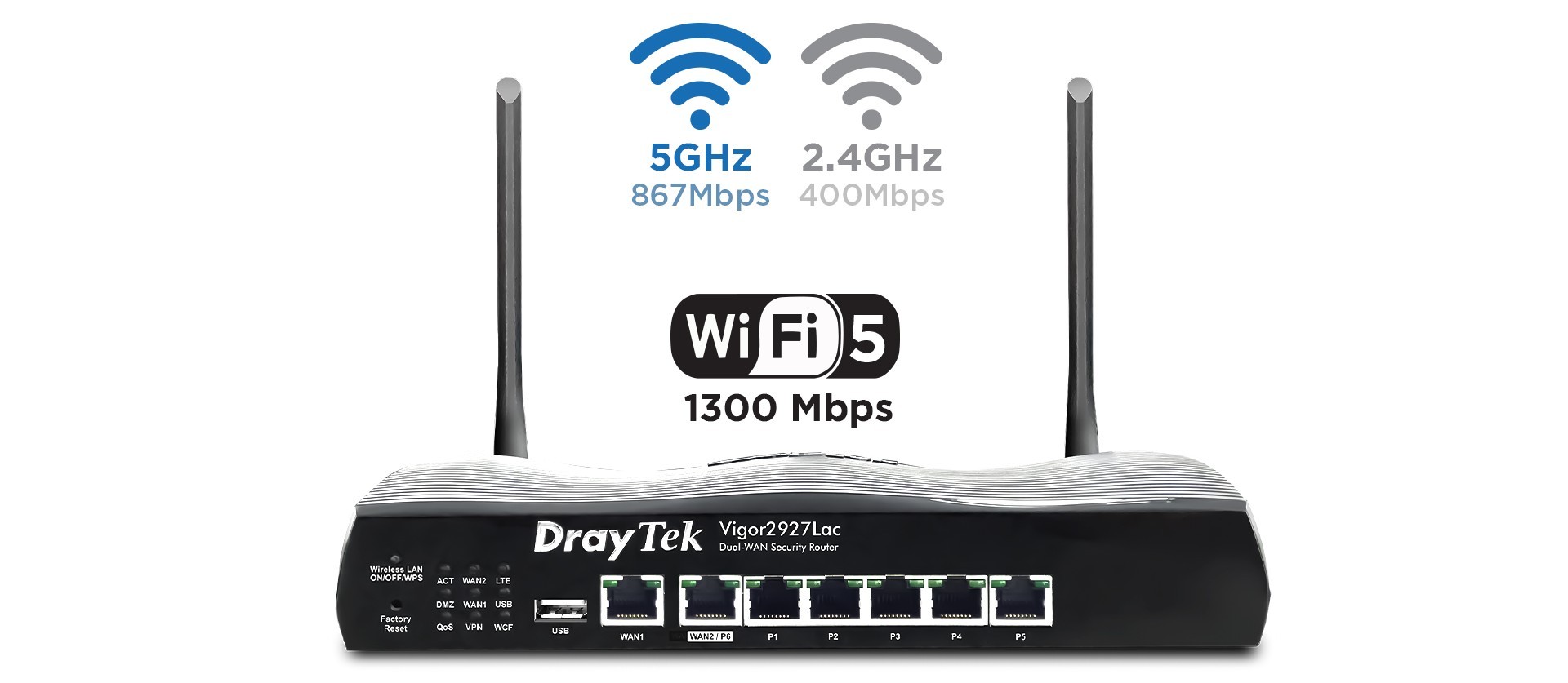 DrayTek Vigor2927Lac tích hợp mạng không dây chuẩn 802.11ac Wave 2 (AC1300), hoạt động hai băng tần (2.4GHz & 5GHz), mang đến tốc độ cao và vùng phủ sóng rộng cho văn phòng hoặc môi trường làm việc nhiều thiết bị.