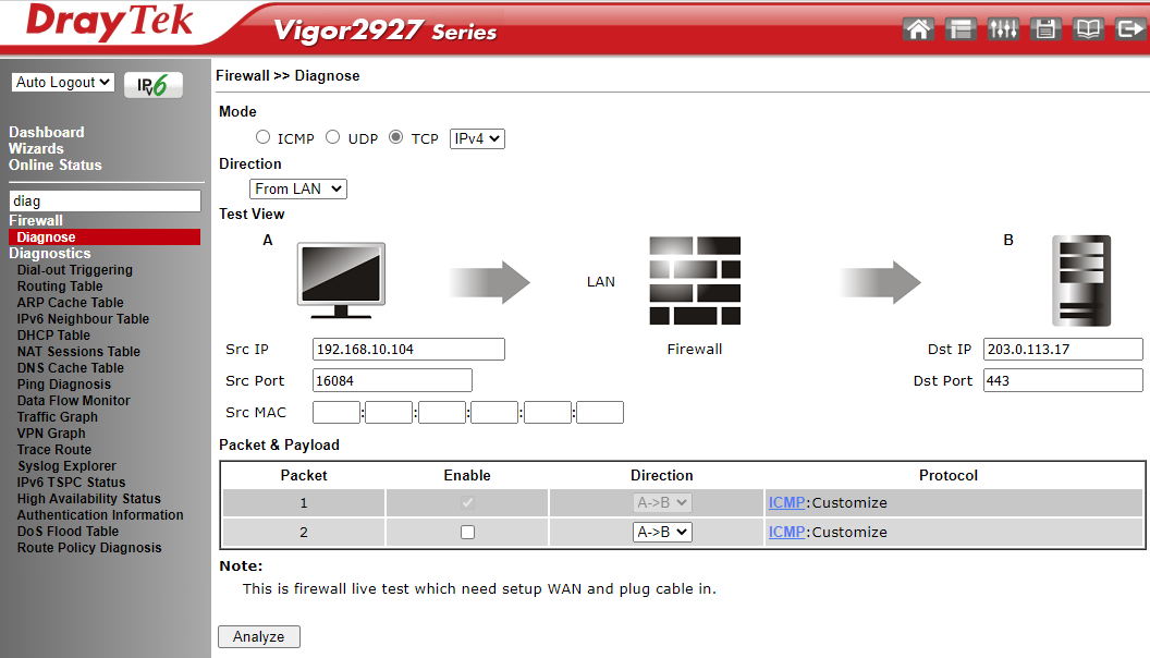 Tường lửa của Vigor2927Lac hỗ trợ đồng thời cả IPv4 và IPv6 thông qua cơ chế Dual-Stack, cho phép áp dụng nhất quán các chính sách về đối tượng, lọc nội dung và VLAN cho cả hai loại. Điều này giúp đảm bảo bảo mật toàn diện và nhất quán, ngay cả trong các hệ thống mạng chuyển tiếp sang IPv6.