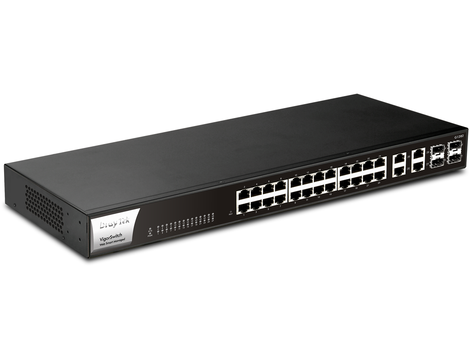 DrayTek VigorSwitch G1282 là switch gigabit được thiết kế cho doanh nghiệp và SOHO (Small Office/Home Office) chạy các ứng dụng mạng khác nhau. Switch sở hữu 24 cổng Ethernet là lựa chọn hoàn hảo cho hệ thống mạng wireless AP, IP phone và thiết bị giám sát bằng IP. VigorSwitch G1282 cung cấp tính năng Voice VLAN tự động và QoS giúp nâng cao chất lượng cuộc gọi VoIP. Bên cạnh đó, VigorSwitch G1282 còn trang bị 4 cổng kết hợp Gigabit SFP/RJ-45 cho uplink, tính năng Link Aggregation thiết lập trên sản phẩm giúp tăng lưu lượng và độ tin cậy mạng.