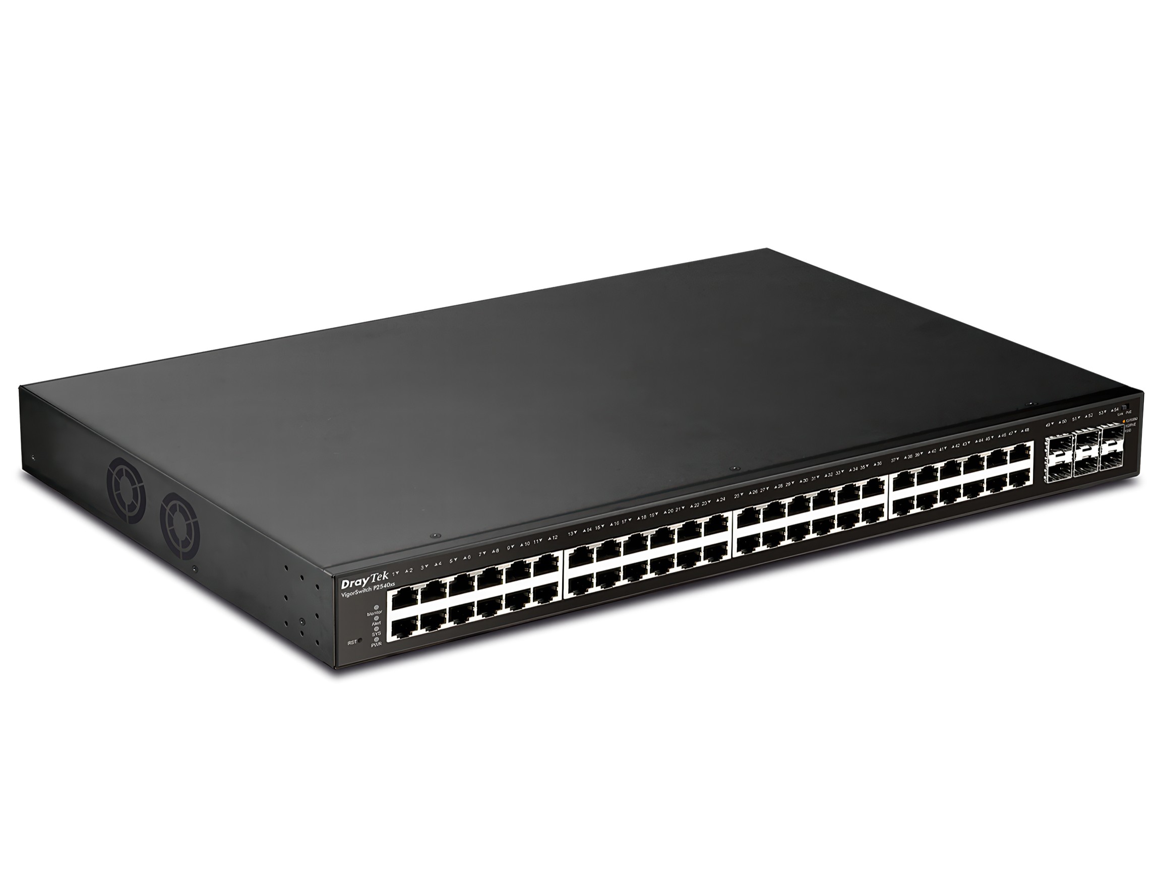 Switch quản lý Layer 2+ với 48 port Gigabit PoE+, 6 slot SFP+ 10GbE, nguồn PoE 400W. Hỗ trợ VLAN Routing, DHCP Server, ONVIF và quản lý tập trung qua DrayTek Cloud.