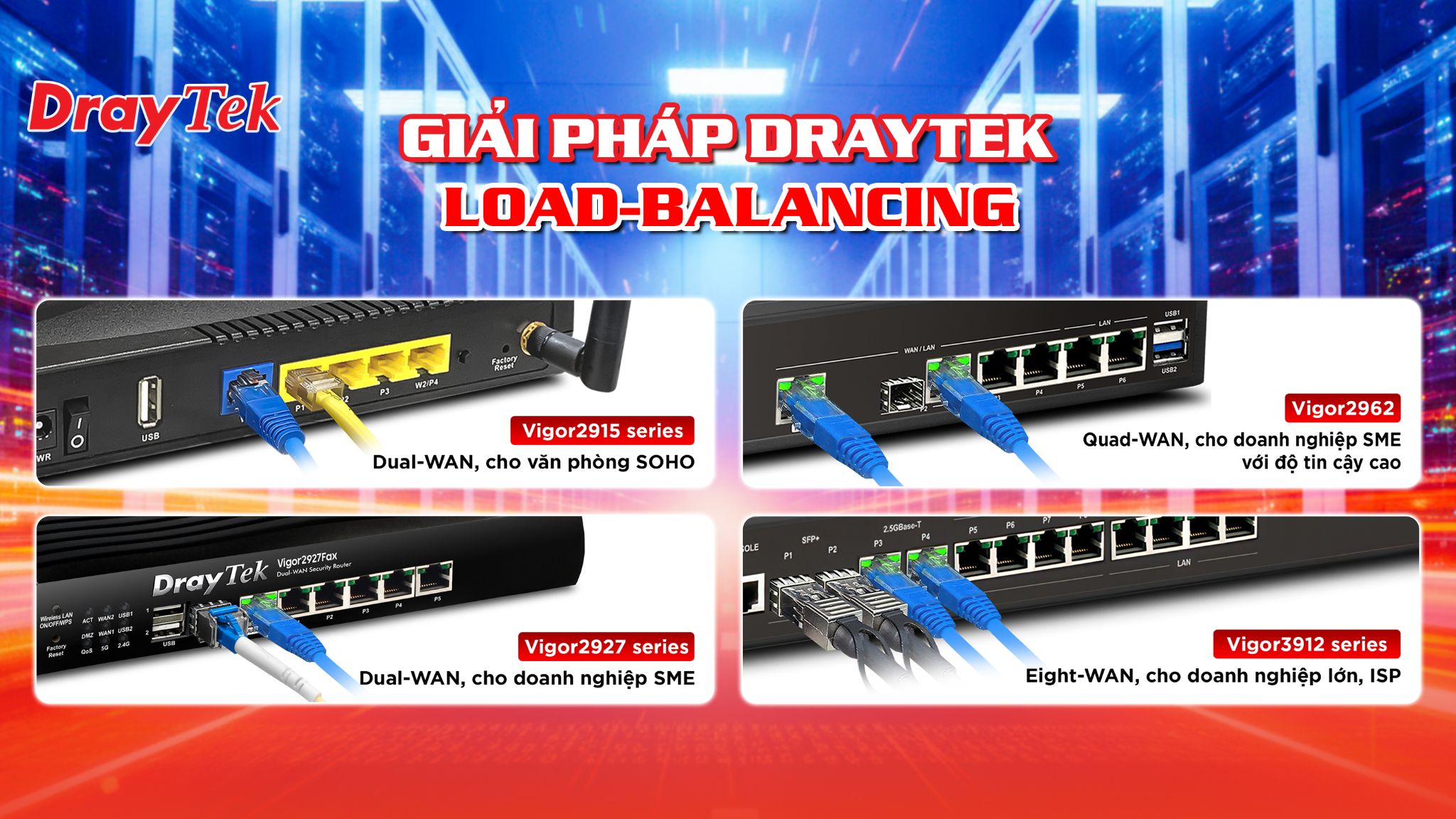 Hiện nay, DrayTek cung cấp nhiều dòng router cân bằng tải đa dạng, gồm Vigor3912/Vigor3912S, Vigor2962, Vigor2927 series và Vigor2915 series, đáp ứng linh hoạt nhu cầu từ doanh nghiệp nhỏ đến môi trường mạng quy mô lớn.