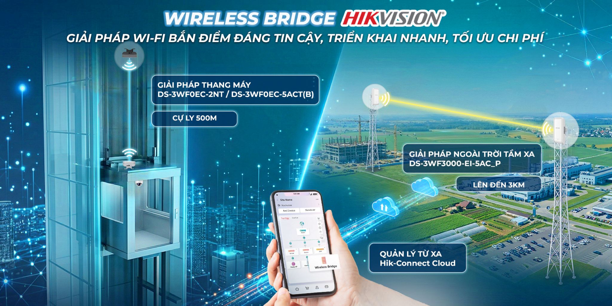 Wireless Bridge là giải pháp Wi-Fi bắn điểm được Hikvision phát triển nhằm giải quyết bài toán chi phí và thời gian thi công tại các khu vực khó triển khai cáp mạng truyền thống như thang máy, công trình ngoài trời hoặc các điểm kết nối tầm xa. Với dòng sản phẩm đa dạng, hoạt động theo mô hình điểm-điểm (PtP: Point-to-Point) hoặc điểm-đa điểm (PtMP: Point-to-Multipoint), Hikvision không chỉ mang lại kết nối đáng tin cậy, lắp đặt nhanh chóng mà còn tối ưu chi phí theo từng nhu cầu sử dụng.