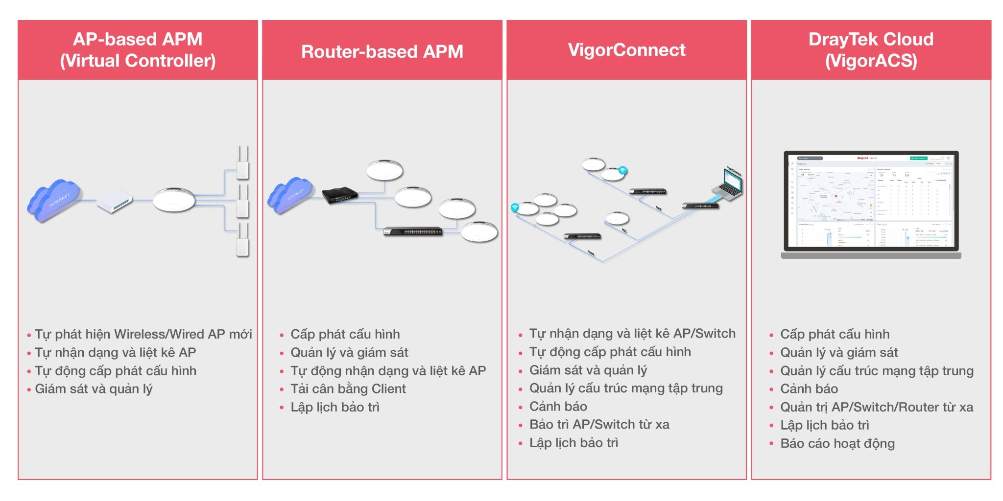 DrayTek đã phát triển một hệ sinh thái quản lý mạng không dây toàn diện, dựa trên triết lý phân tầng với khả năng mở rộng linh hoạt, gồm AP-based APM, Router-based APM, VigorConnect và DrayTek Cloud (VigorACS). Điểm nổi bật là các giải pháp này đều được DrayTek cung cấp hoàn toàn miễn phí, không phát sinh phí bản quyền hàng năm hay giấy phép phần mềm bổ sung.