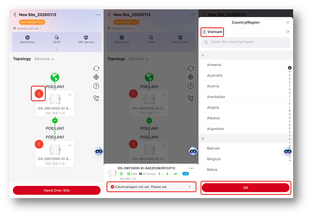 Bước 2: Thêm thiết bị vào Site & chọn khu vực