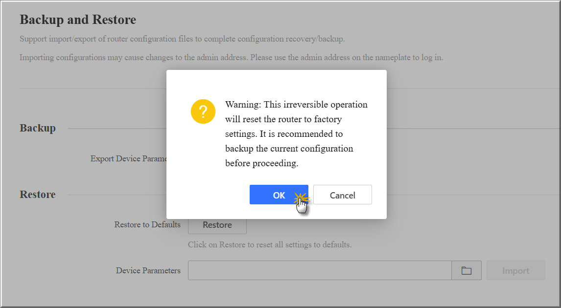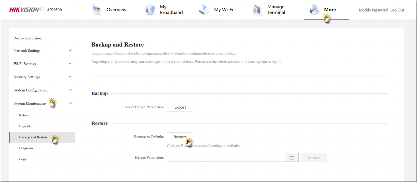 • Vào More >> System Maintenance >> Backup & Restore, Tại Restore Default nhấn Restore