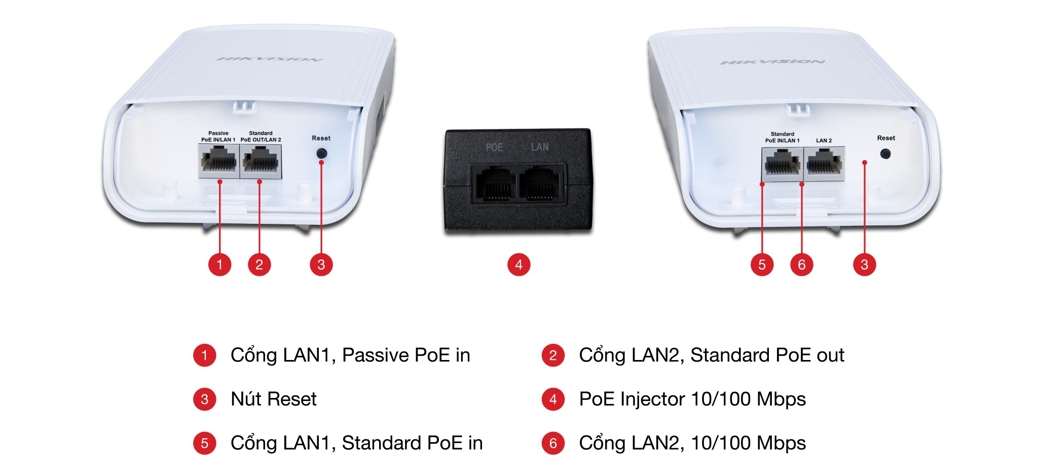Với thiết bị thu (CPE) tại điểm cuối, thiết bị nhận nguồn thông qua cổng LAN 1 chuẩn Passive PoE Input. Đặc biệt cổng LAN 2 hỗ trợ Standard PoE Output để cấp nguồn cho camera IP hoặc thiết bị đầu cuối khác.