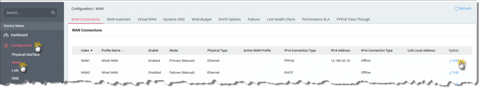 Vào Configuration >> WAN, chọn WAN đang kết nối đường truyền có IP Tĩnh >> nhấn Edit