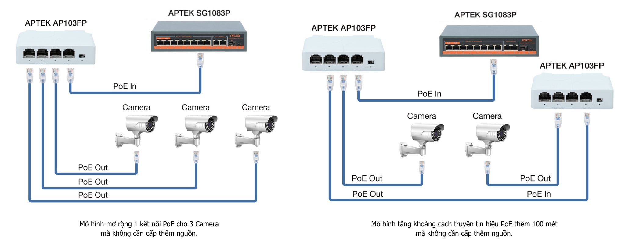 PoE Extender APTEK AP103FP là giải pháp tiện lợi giúp mở rộng kết nối PoE 1-ra-3 cho PoE Camera mà không cần cấp thêm nguồn bổ sung. AP103FP được thiết kế với khả năng nhận nguồn trực tiếp từ Switch PoE và cấp lại cho 3 PoE Camera cùng lúc, giúp kết nối các thiết bị mạng đơn giản hơn, đáp ứng nhu cầu sử dụng của nhiều người dùng.