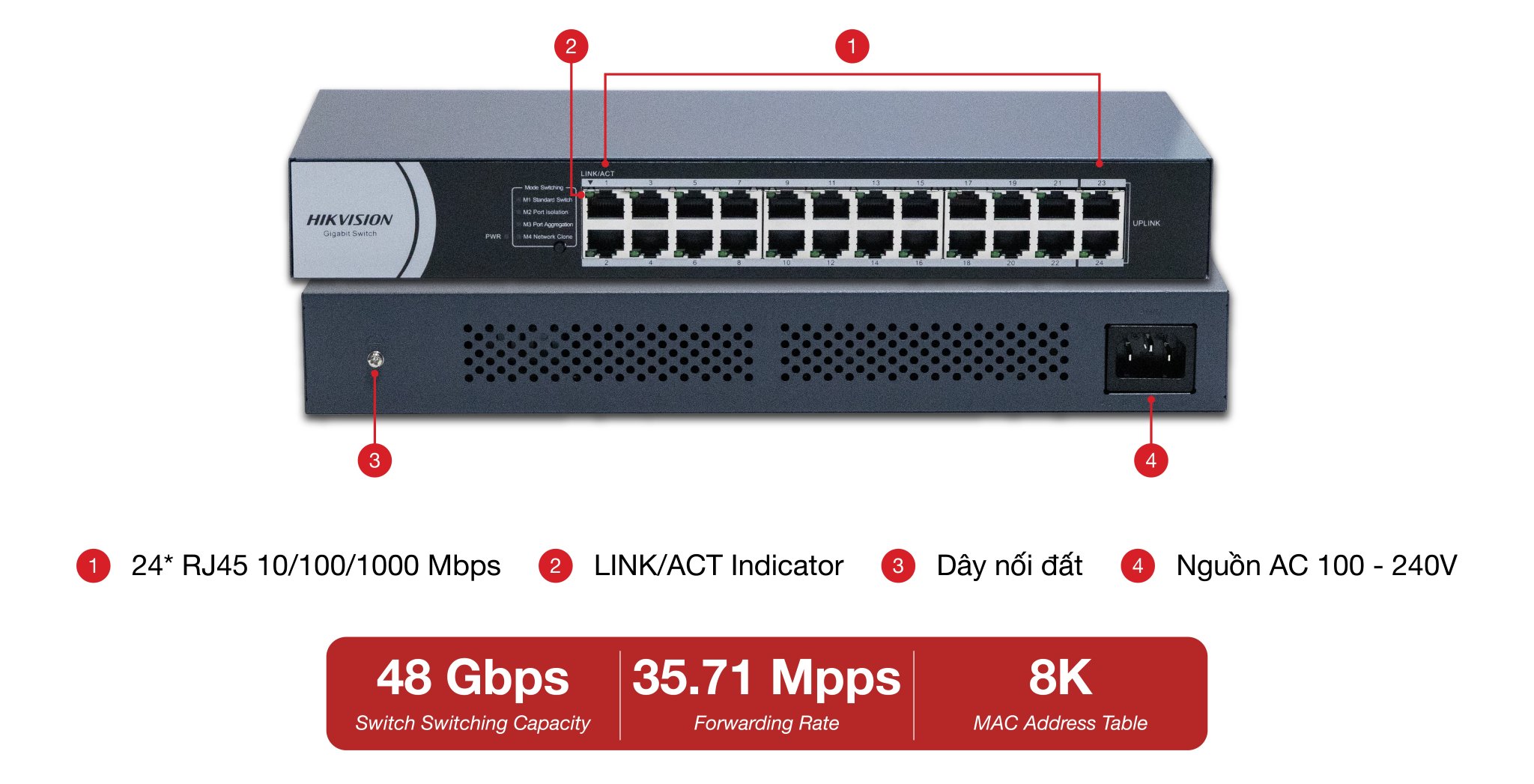 DS-3E0524R-O được trang bị 24 cổng Gigabit RJ45, , trong đó có thể linh hoạt sử dụng 22 cổng cho thiết bị đầu cuối (downlink) và 2 cổng làm uplink để kết nối với router, switch trung tâm hoặc các thiết bị như NAS, NVR tùy theo mô hình triển khai.