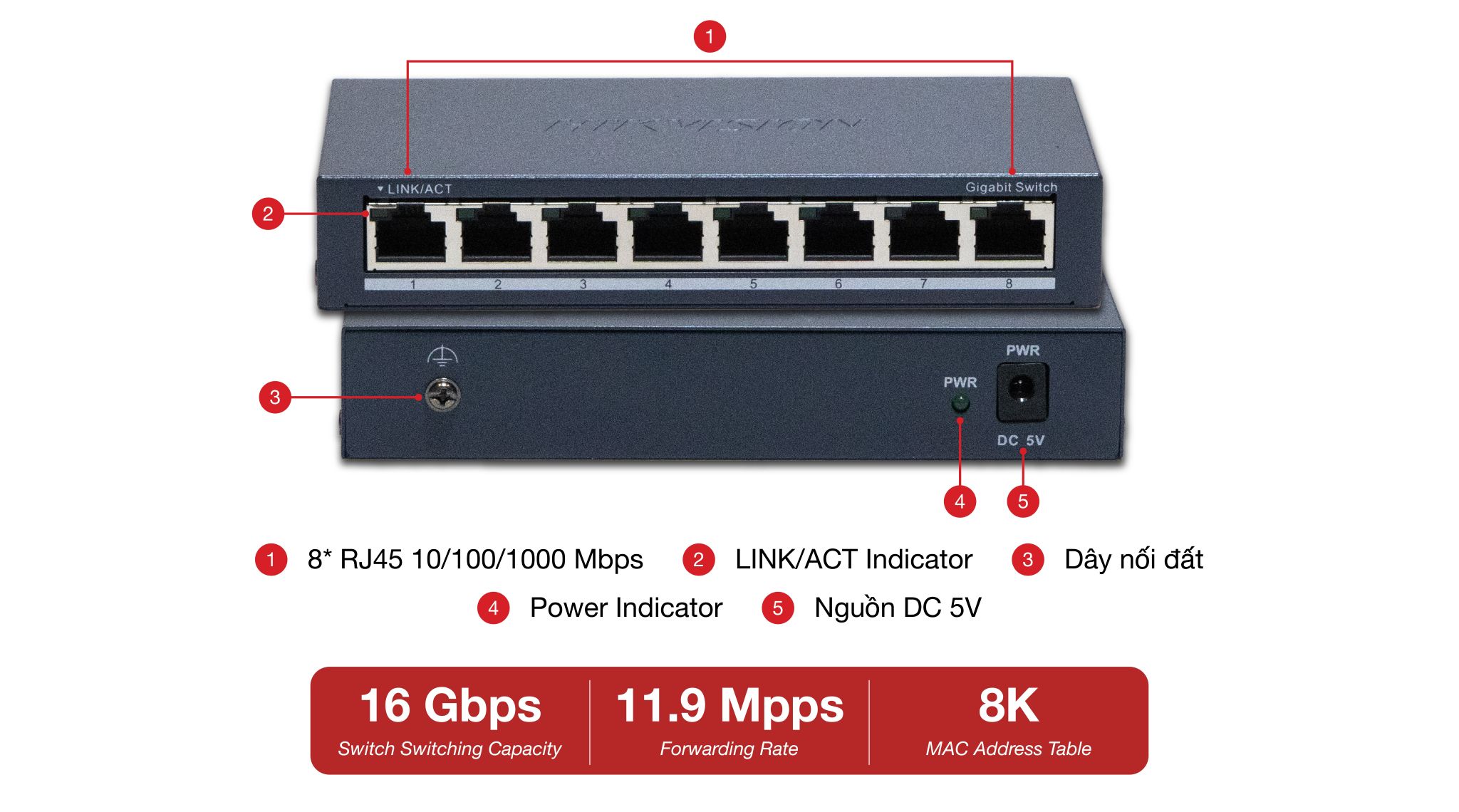 DS-3E0508-O trang bị 8 cổng LAN Gigabit, cho phép truyền tải dữ liệu với tốc độ lên đến 1 Gbps. Nhờ khả năng chuyển mạch 16 Gbps, tốc độ chuyển tiếp 11.9 Mpps cùng bộ nhớ đệm 768 Kbits, DS-3E0508-O đảm bảo băng thông các thiết bị kết nối qua switch luôn ổn định, đáp ứng tốt nhu cầu sử dụng trong văn phòng lẫn dùng trong gia đình.
