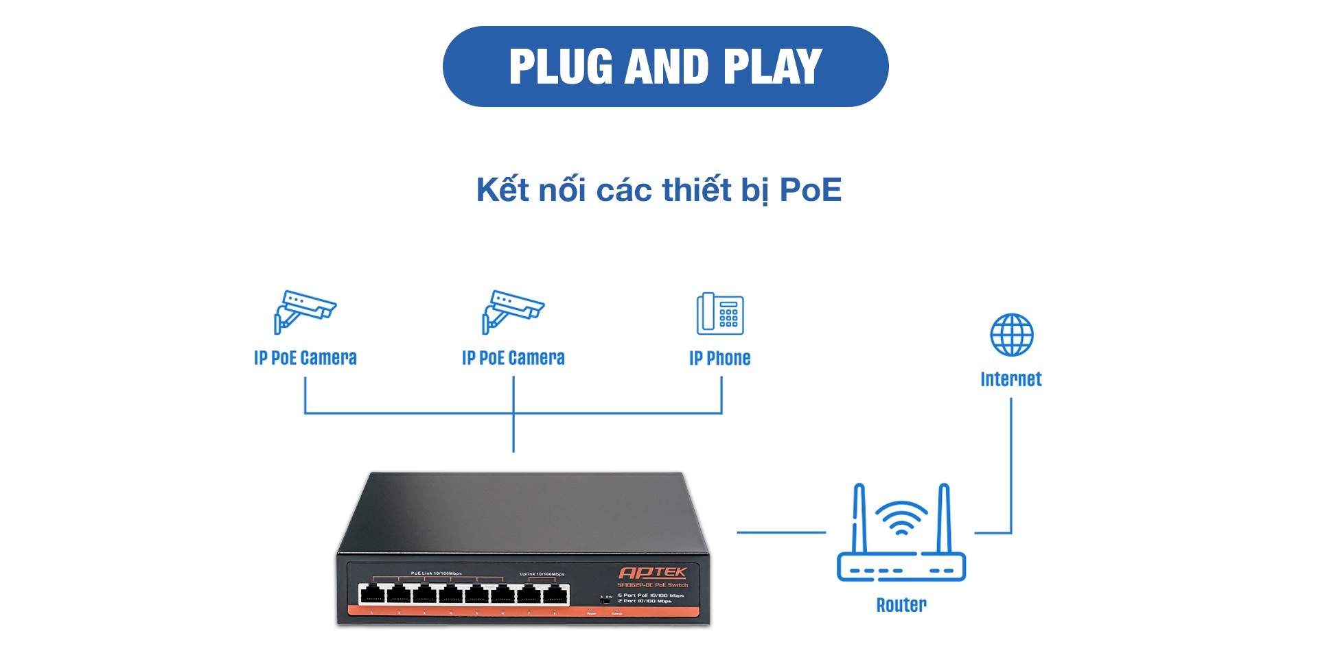 APTEK SF1062P-DC trang bị 6 port RJ45 10/100Mbps, hỗ trợ cấp nguồn qua mạng (PoE+) tối đa 30W mỗi port. Nhờ đó, switch APTEK dễ dàng đáp ứng yêu cầu của thiết bị tiêu thụ điện cao như camera PTZ, camera hồng ngoại. Bên cạnh đó, việc hỗ trợ cấp nguồn qua mạng giúp việc thi công tiện lợi hơn do không phải kéo thêm cáp cấp nguồn riêng đến từng camera.