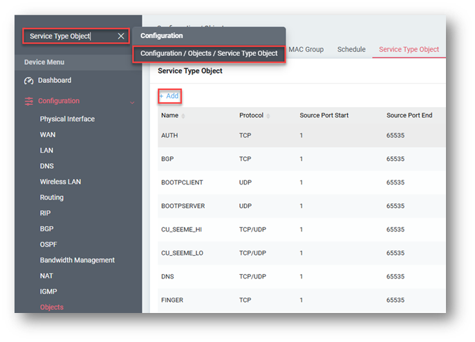 Tại công cụ ”Search”, tìm kiếm từ khóa “Service Type Object” và nhấn chọn cấu hình với đường dẫn Configuration → Objects → Service Type Object như hình dưới