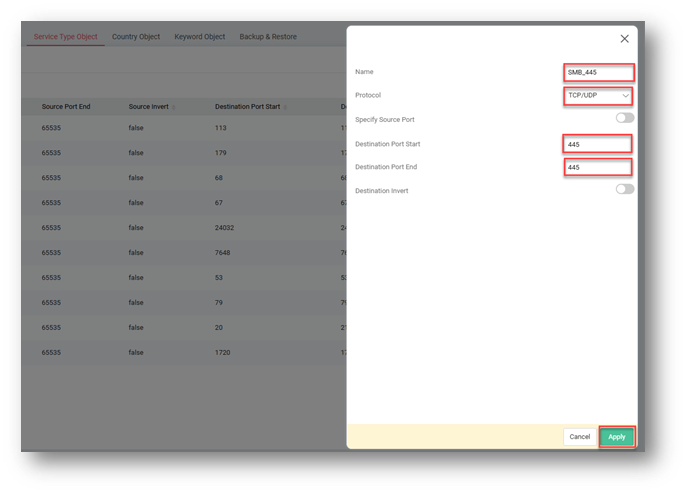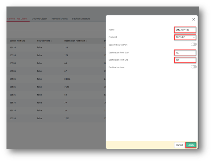 Dịch vụ SMB sử dụng các port 445, 137-139, vì vậy cần tạo 2 Service Type Object cho các port này: