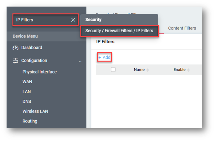 Tại công cụ ”Search”, tìm kiếm từ khóa “IP Filters” và nhấn chọn cấu hình với đường dẫn Security → Firewall Filters → IP Filters như hình dưới