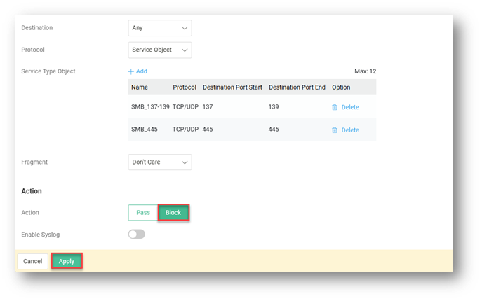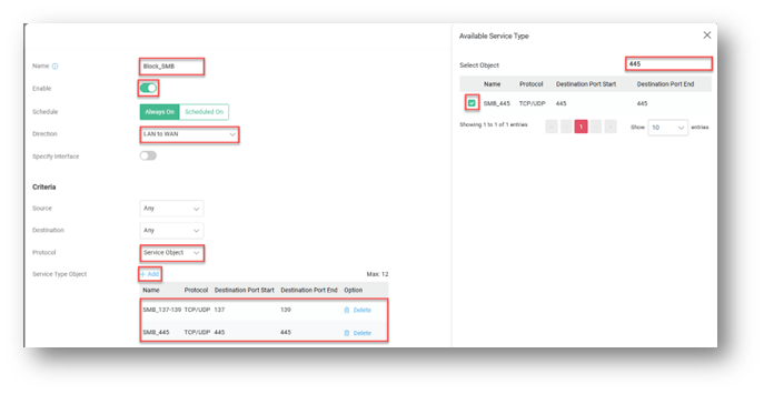 Hiện nay xuất hiện rất nhiều chủng loại Virus, sử dụng giao thức SMB để truyền và phát tán. Dẫn đến nguy cơ mất bảo mật, an toàn dữ liệu, đồng thời gây tắt nghẽn hệ thống mạng, khiến hệ thống hoạt động không ổn định. Một trong những biện pháp hạn chế vấn đề này chính là chặn thiết bị bên trong kết nối SMB ra ngoài Internet. Cách thực hiện như sau: