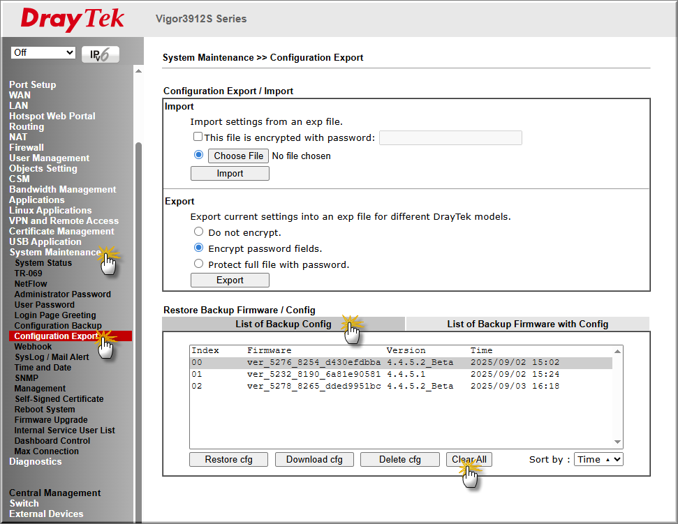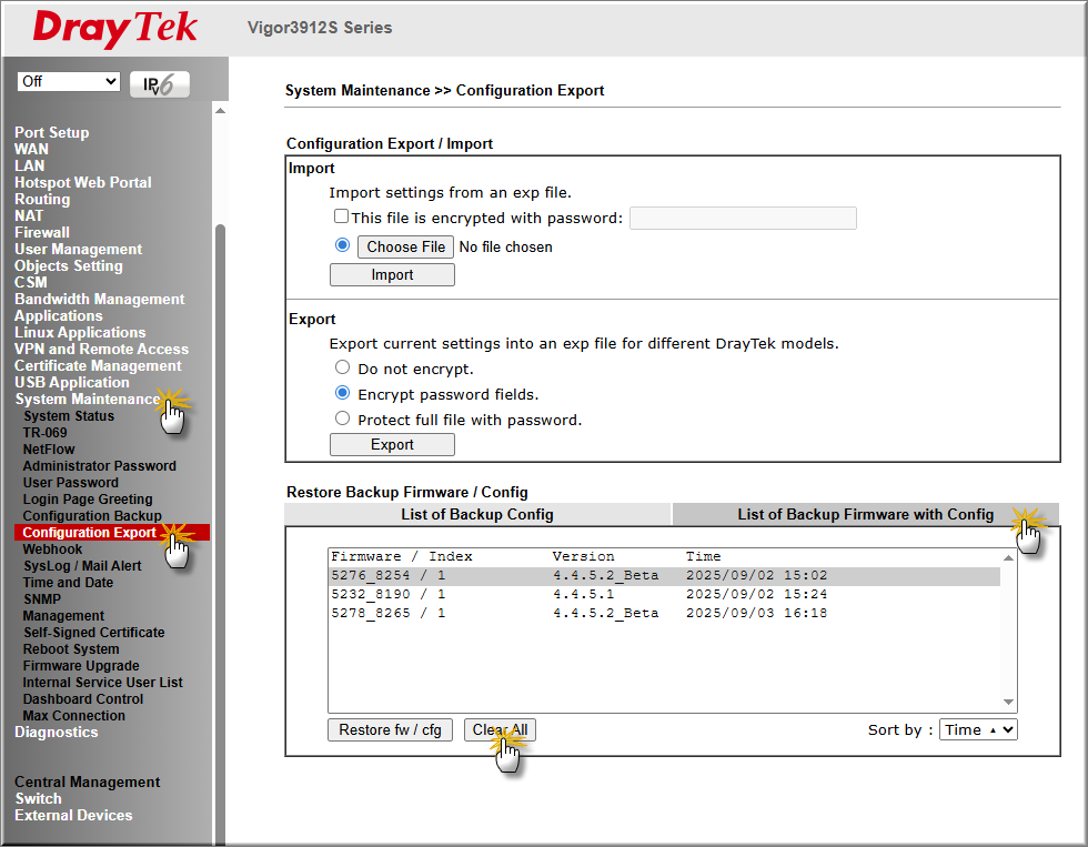 Tại Tab List of Backup firmware with config >> Nhấn Clear All