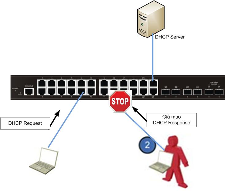 Khi gắn máy tính vào VigorSwitch, Client sẽ gửi một gói tin DHCP Request. Lúc này chỉ những DHCP Server được cấp phép trên VigorSwitch mới có quyền gửi gói tin Response, những DHCP Server không được phép sẽ bị chặn lại.